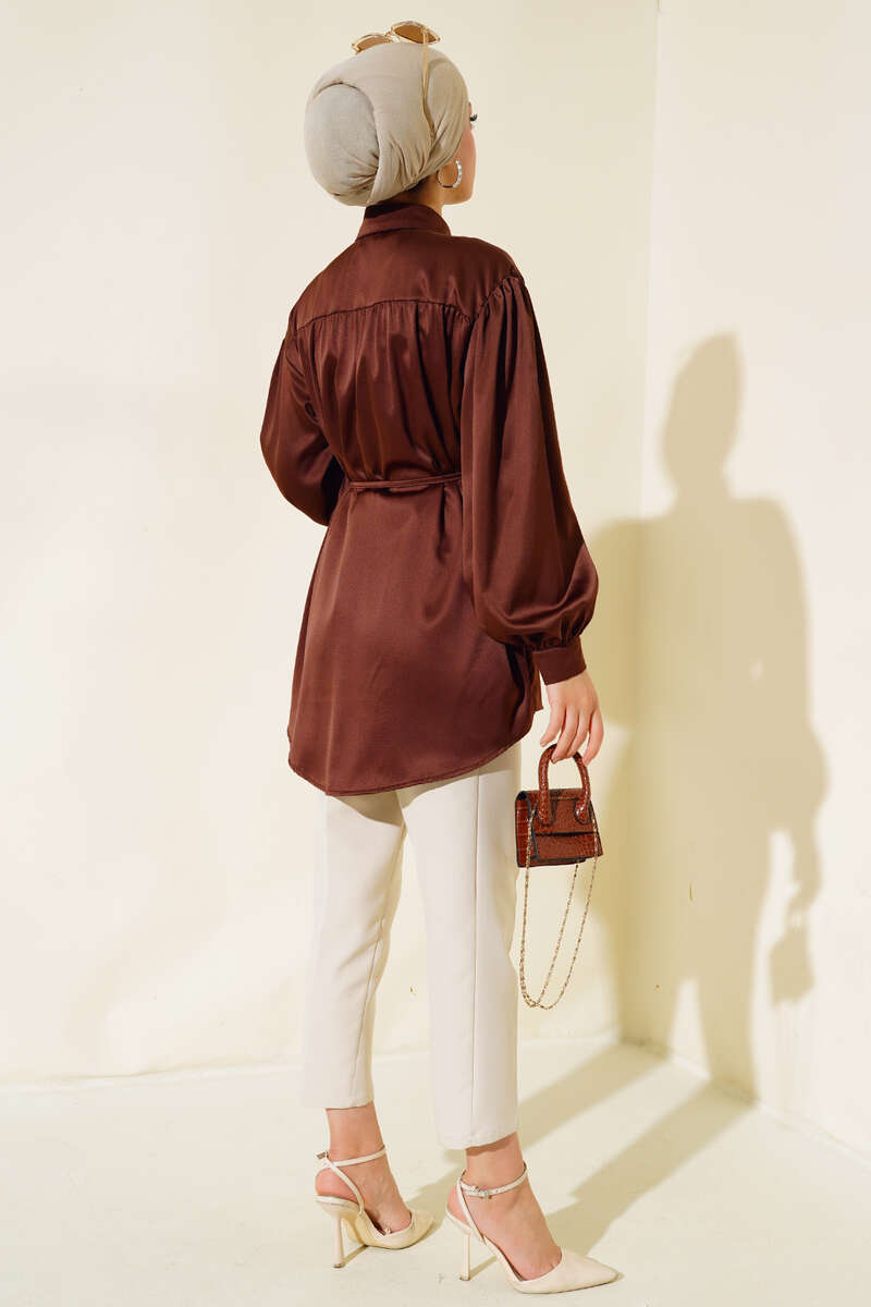 Yeni sezon gömlek modelimiz sizlerle beraber. Gömleğimizin omuzu büzgülüdür. Kol bilekleri manşetli ve düğmelidir. Gömleğimizin önü boydan gizli düğmelidir. Kendi kumaşından bir adet ip bağcığı vardır. Önü kısa arkası uzun modeldir. Şık ve zarif olan saten gömleğimiz renk seçenekleriyle sizleri bekliyor.