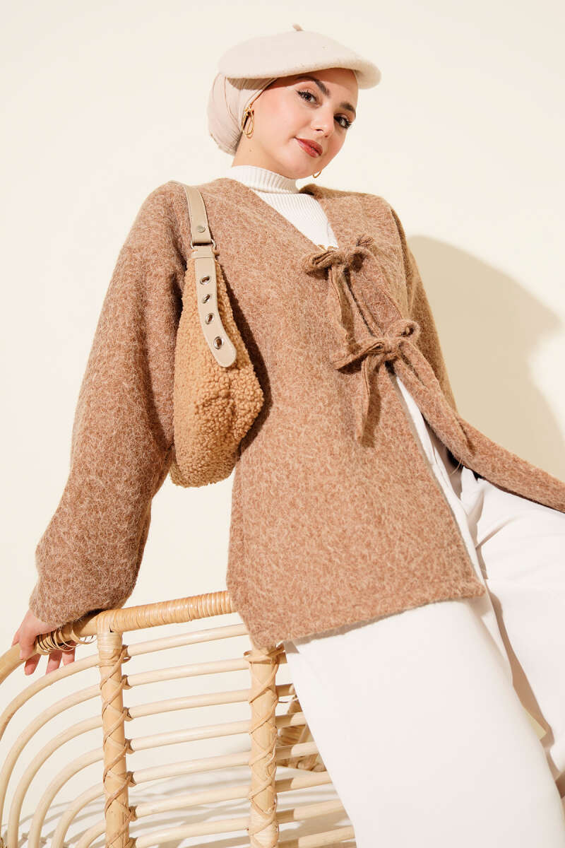 Kalın Çizgili Düğmeli Kısa Triko Hırka Kahve