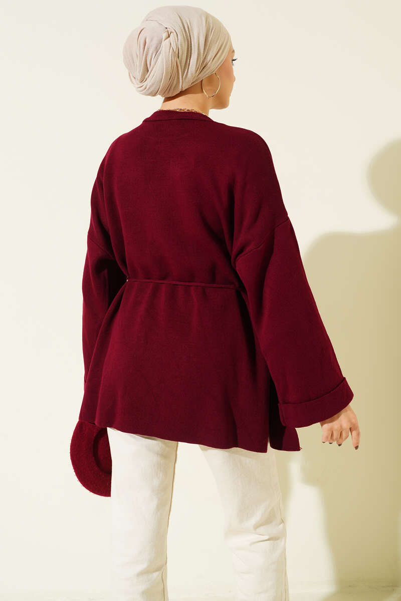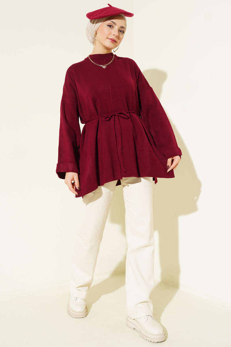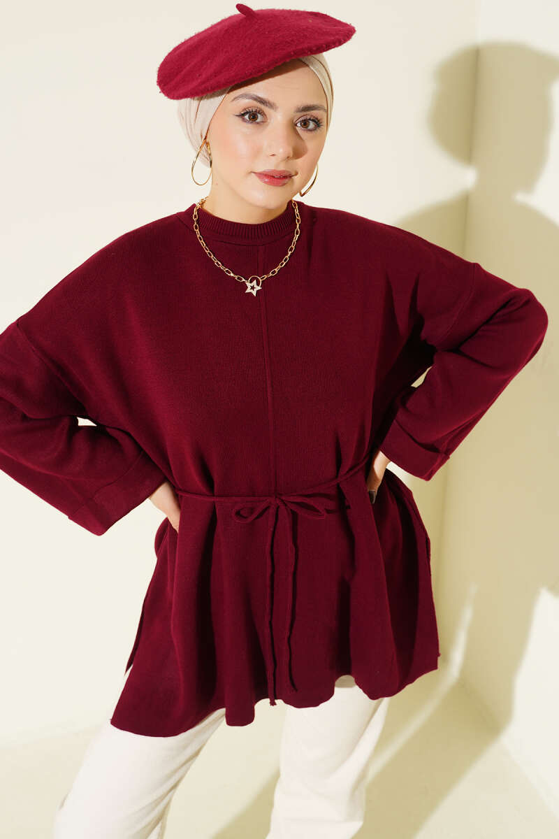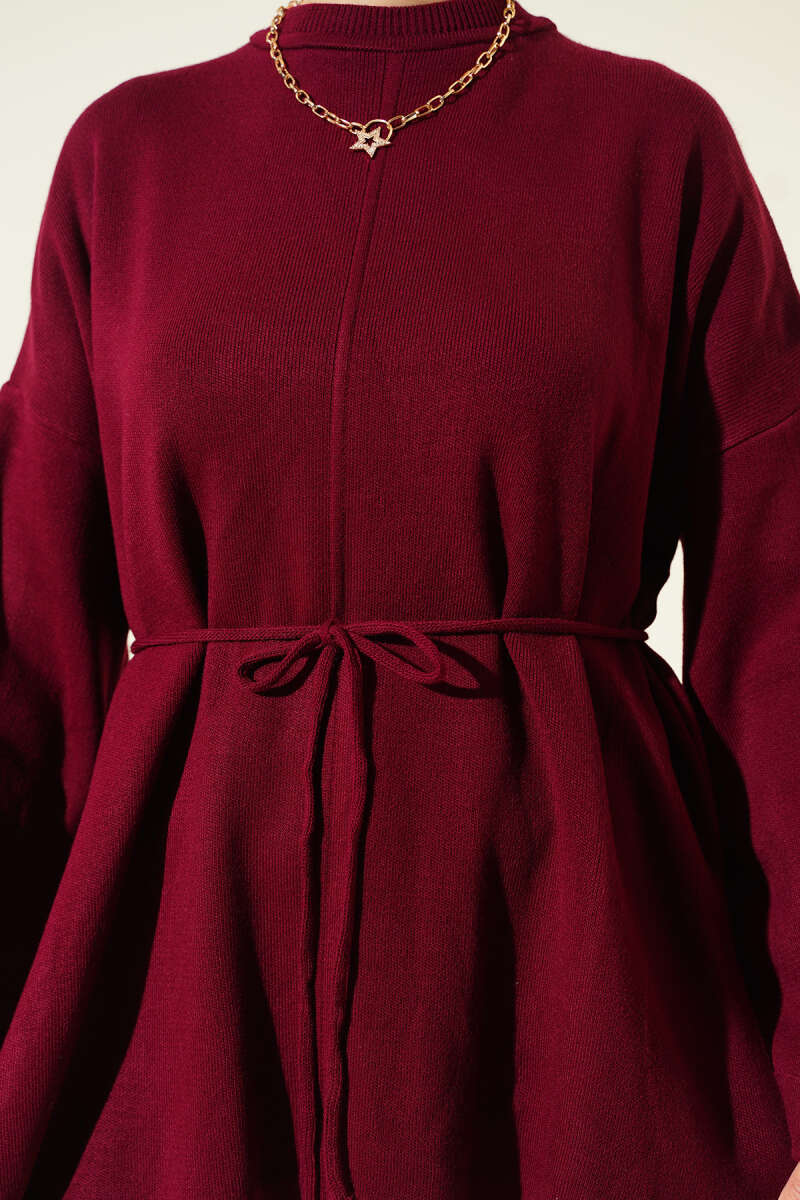 Yatay Çizgili Fitilli Triko Tunik Bordo