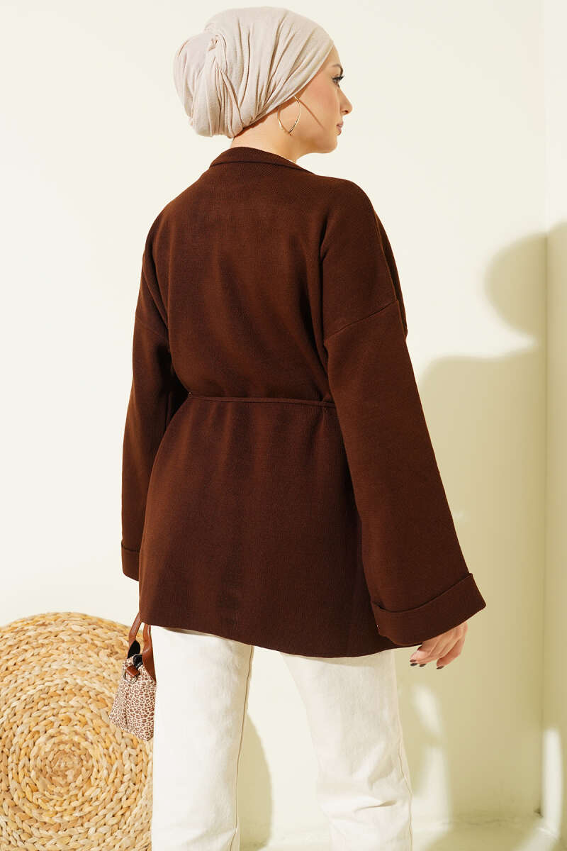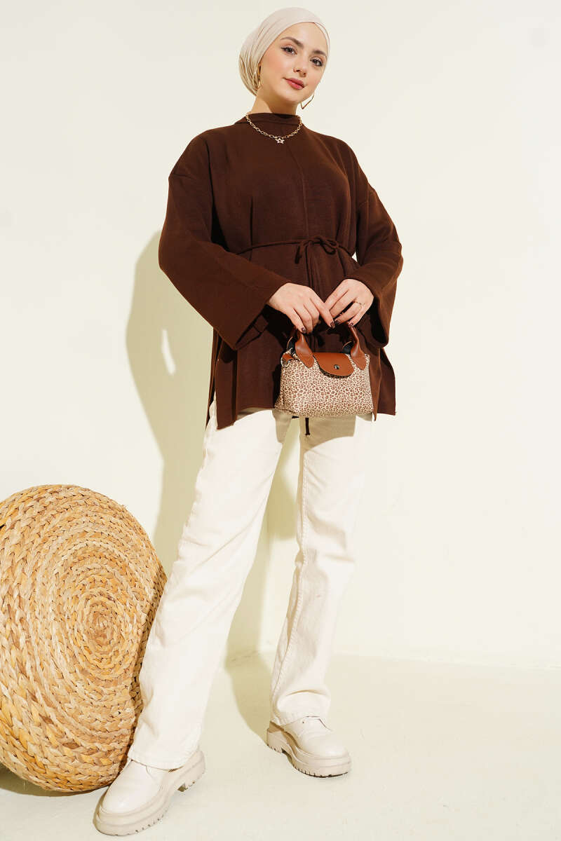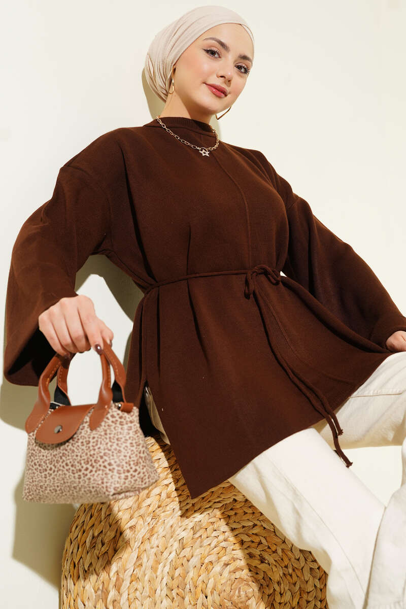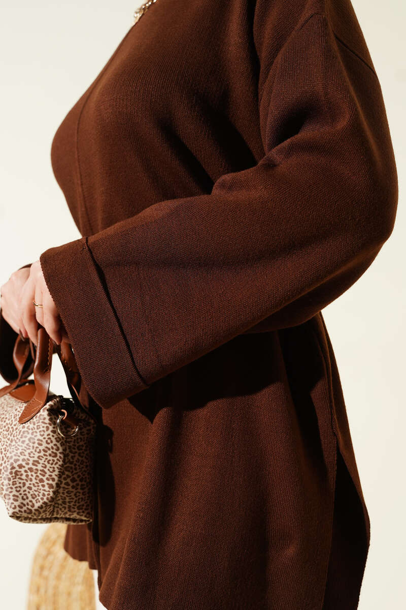 Balıkçı Yaka Fitilli Salaş Triko Tunik Kahve