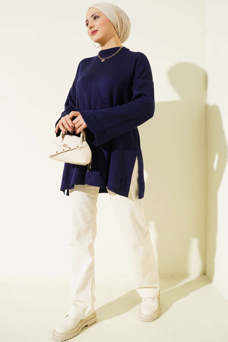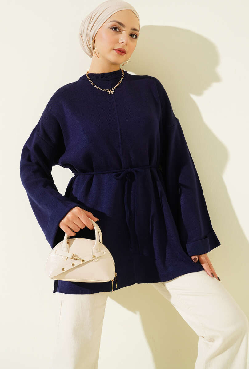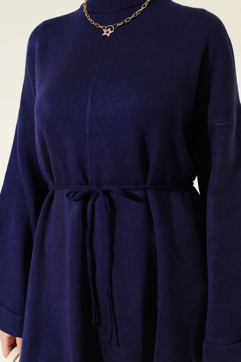 Yatay Çizgili Fitilli Triko Tunik Lacivert