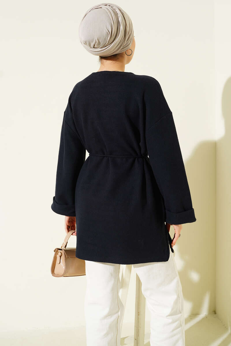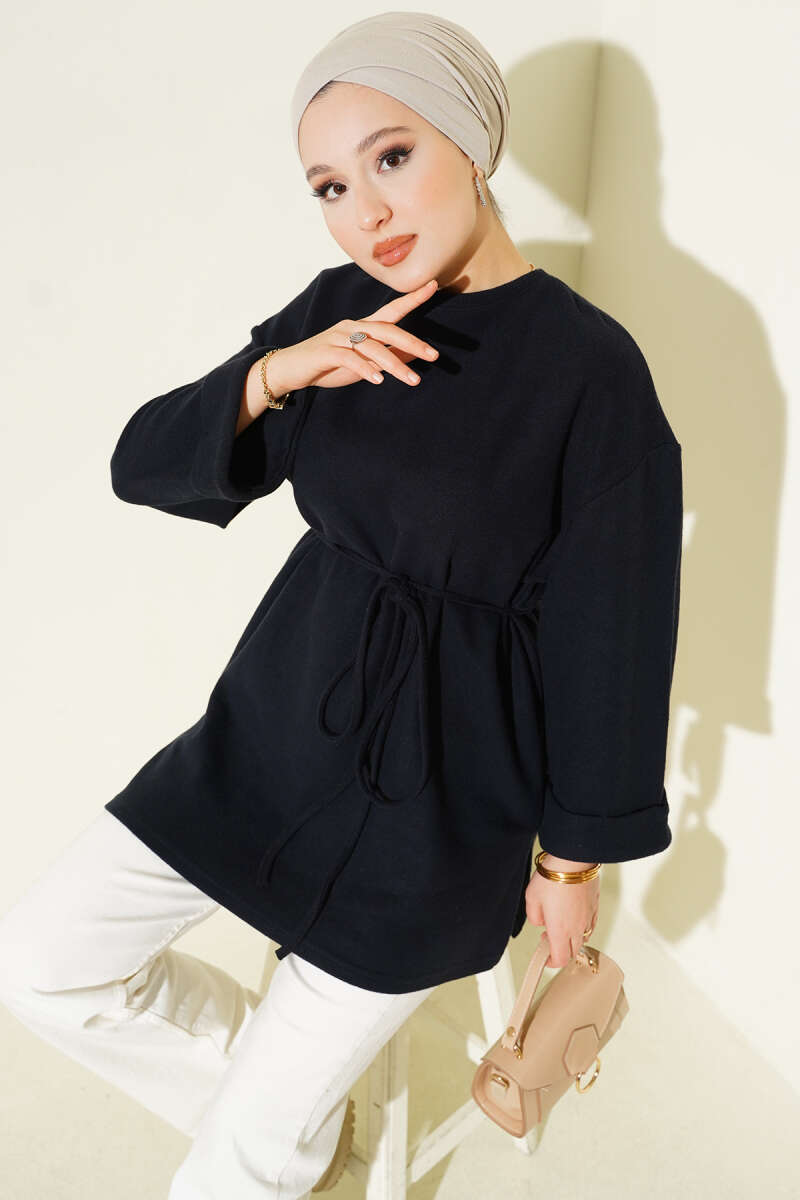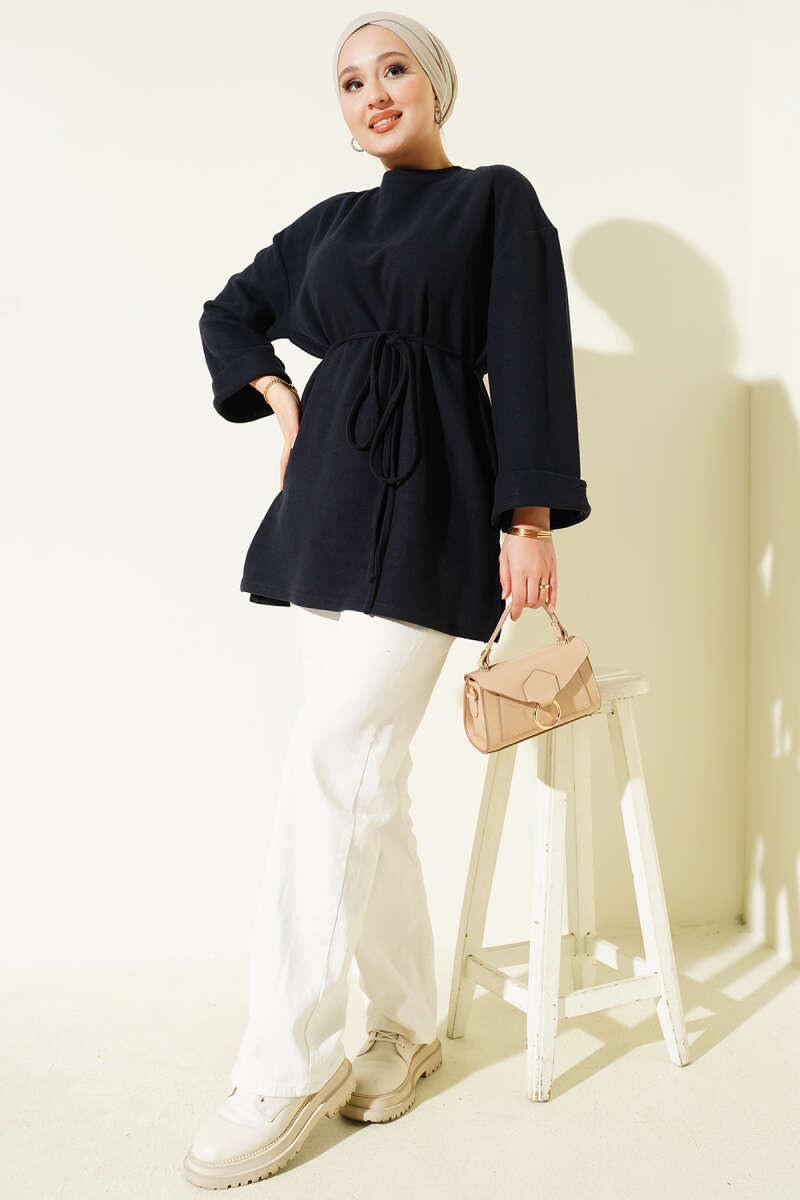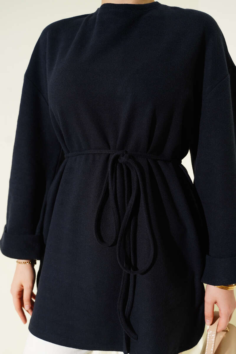 İp Bağlamalı Bisiklet Yaka Tunik Lacivert