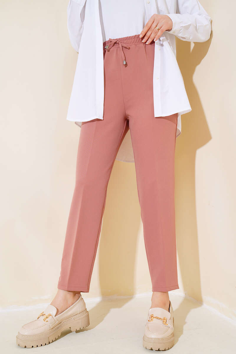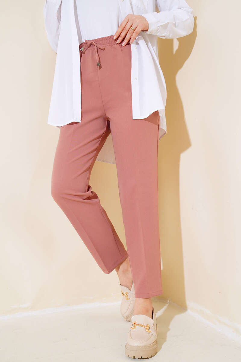 Yeni model pantolonlar kombinlerinizle buluşmak için sizi bekliyor. Pantolonun beli lastiklidir. İp detayı ayrı bir hava katmıştır.. Gömlekleriniz ve tunikleriniz ile kendinize zariflik katabileceğiniz bu pantolon harika kumaşı sayesinde iç göstermemesinden dolayı rahatlıkla satın alabilirsiniz.