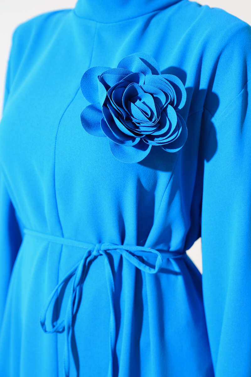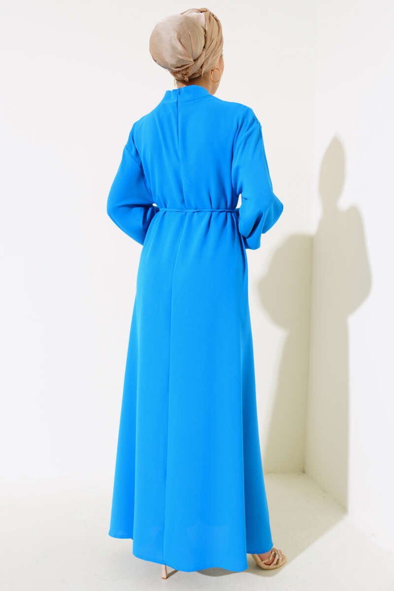 Yarım Yaka Fermuarlı Cepli Kot Elbise Mavi