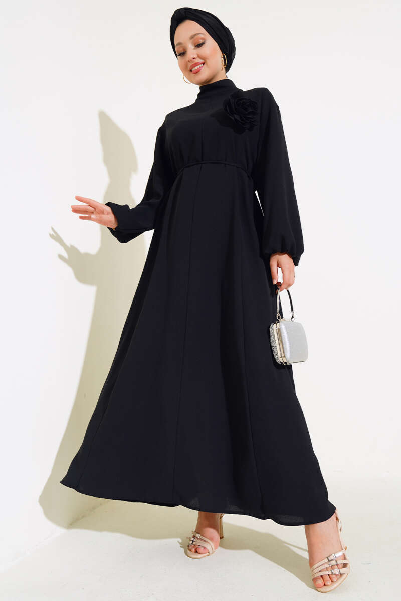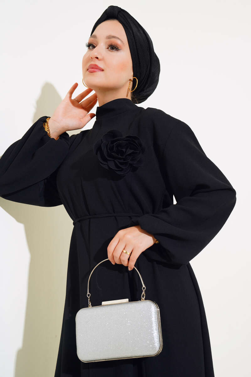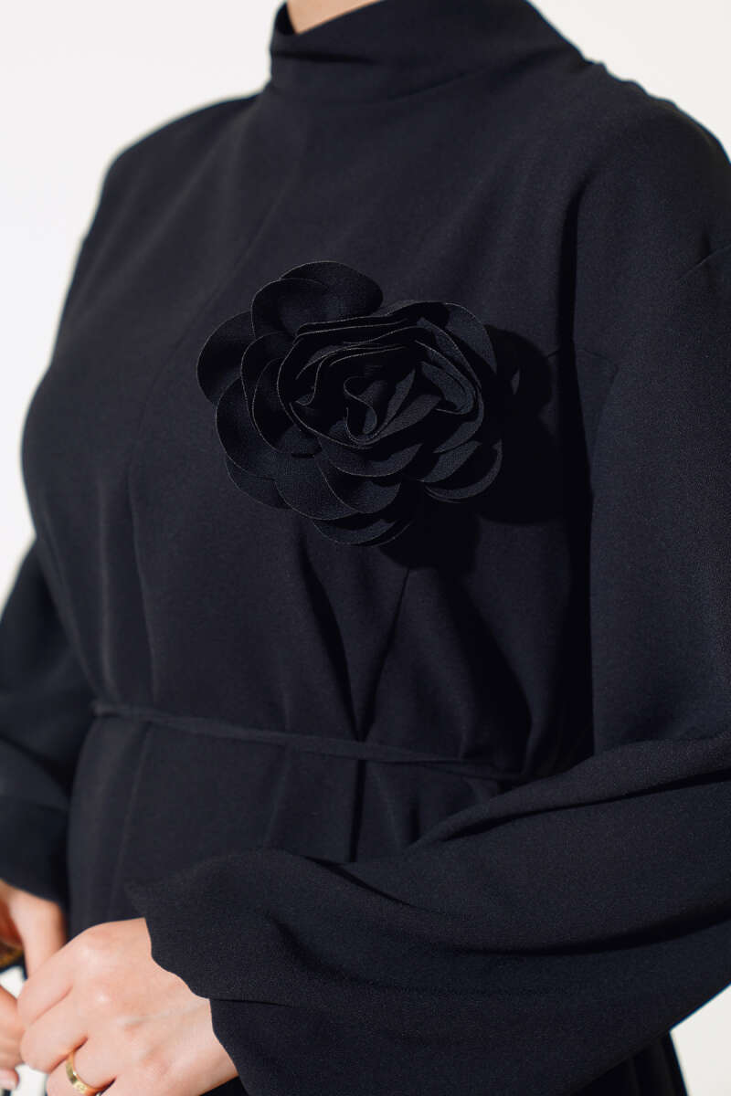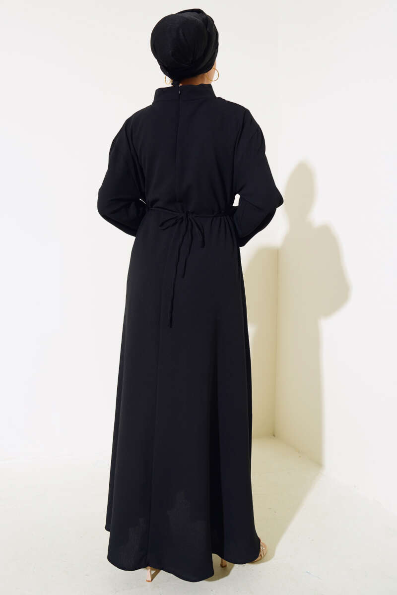 Kuşaklı Dik Fitilli Kaşe Elbise Siyah