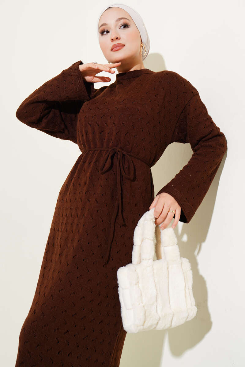 Bisiklet Yaka Bel Tünelli Loyşa Elbise Kahve