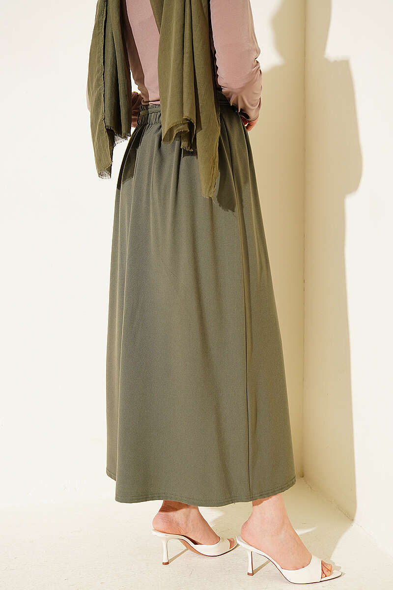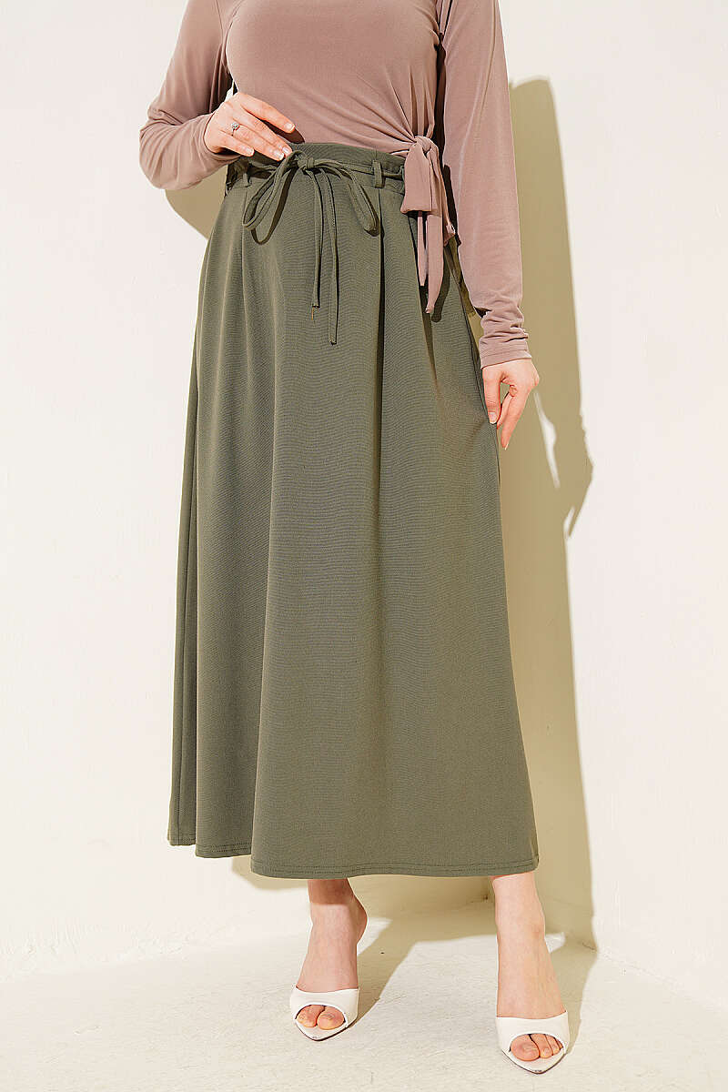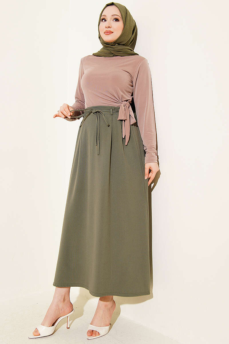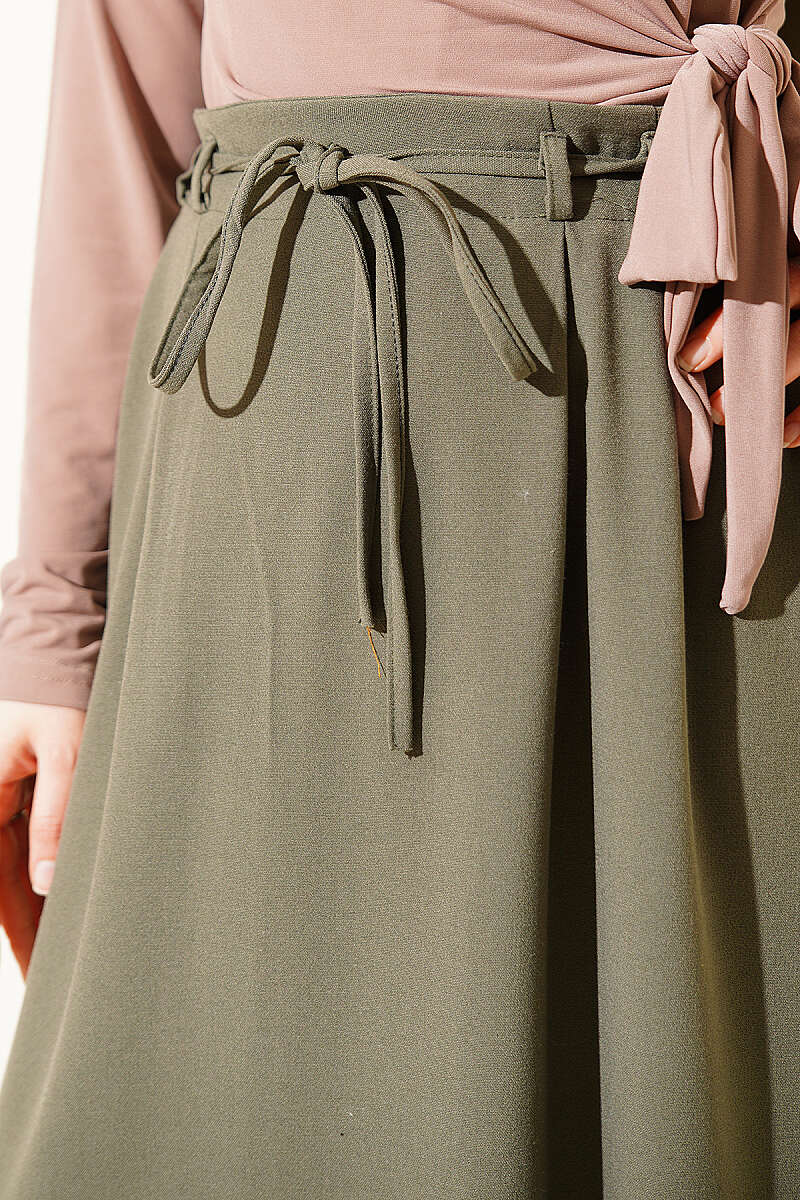 İp Kuşaklı Çift Pensli Etek Haki
