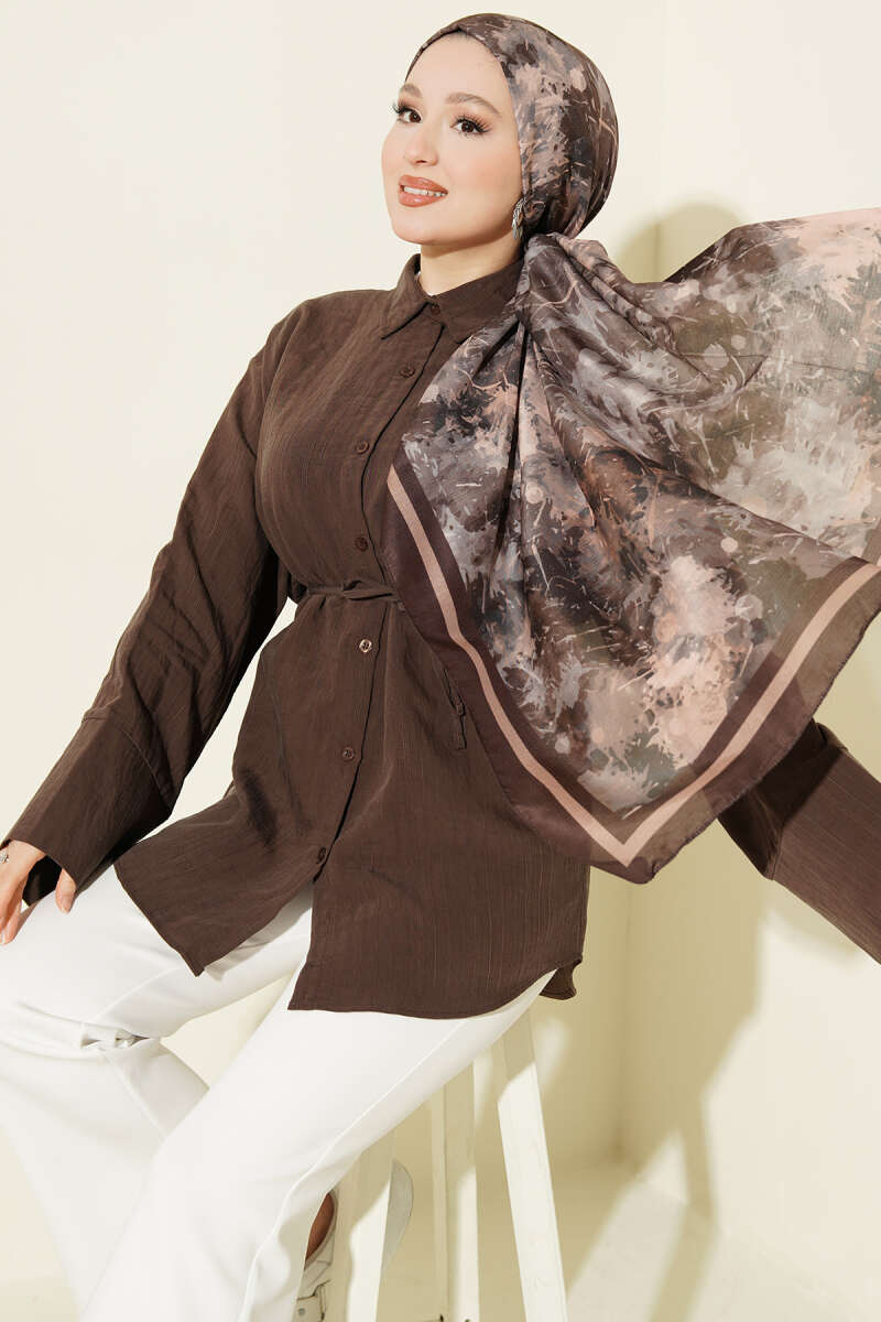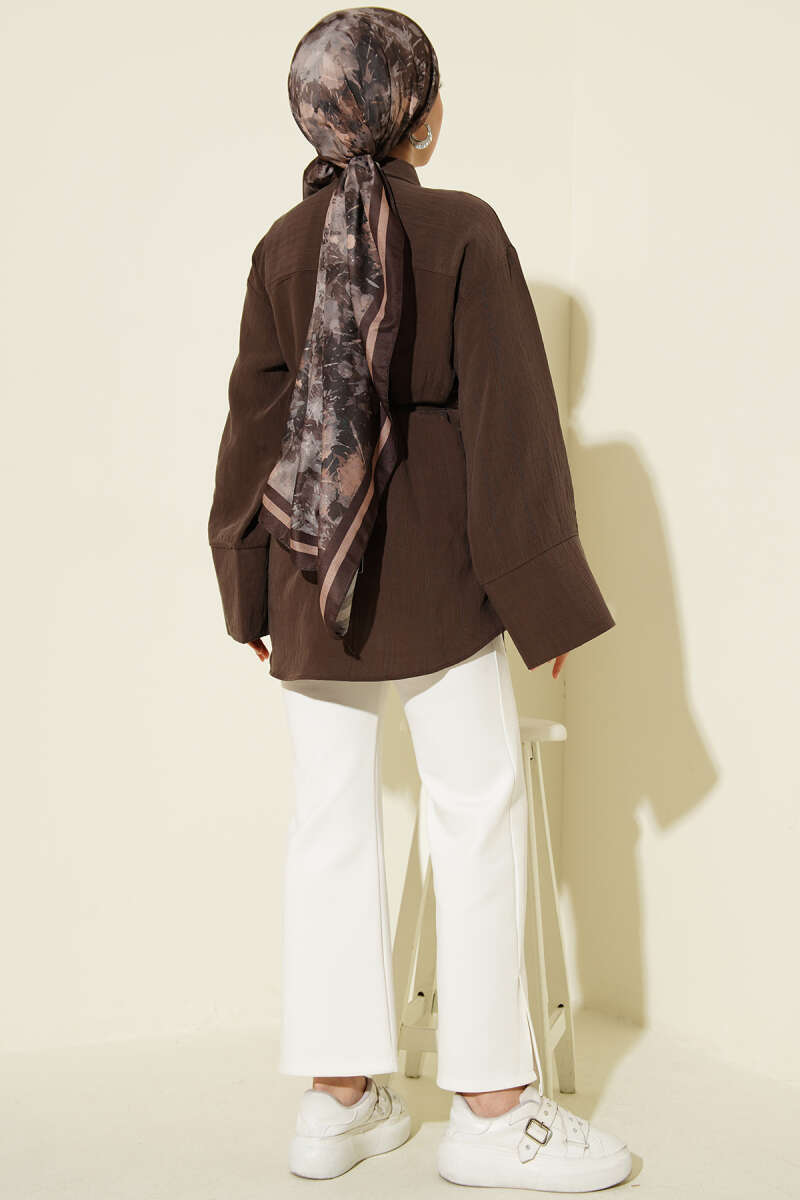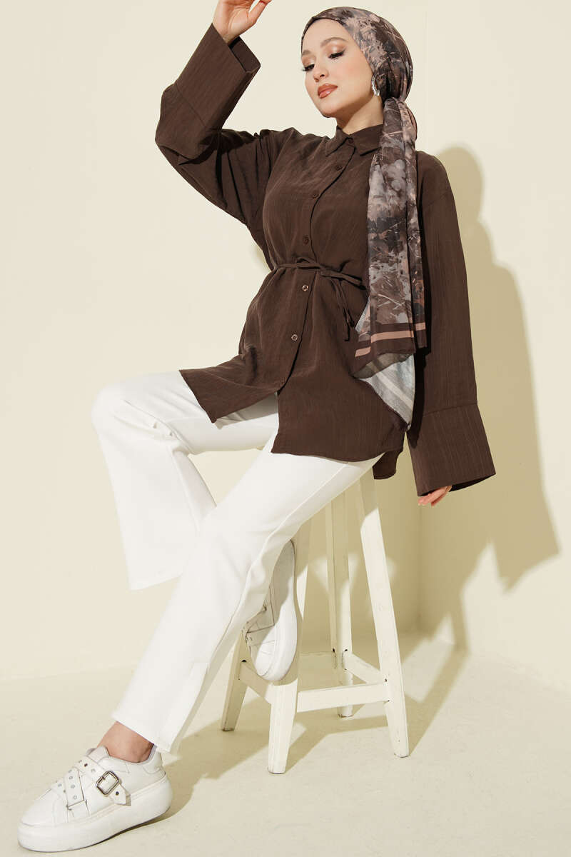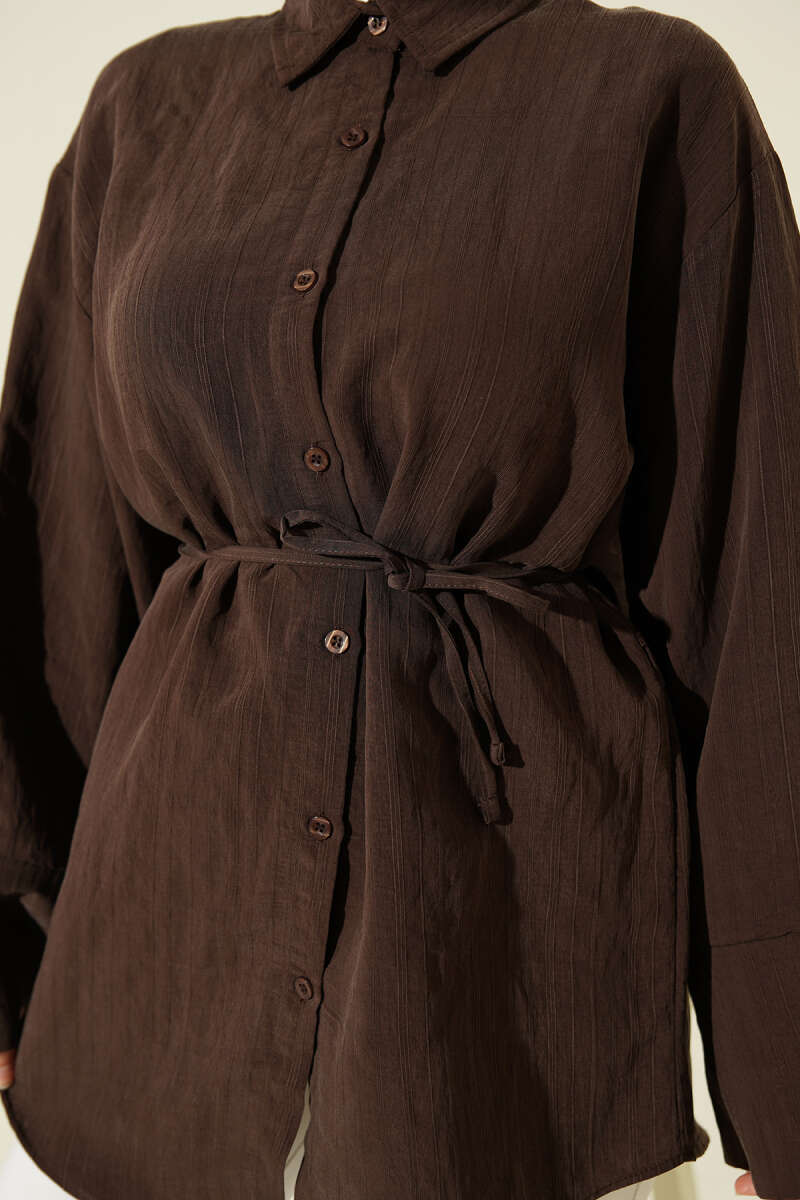 Brit Düğmeli İp Kuşaklı Tensel Gömlek Kahve