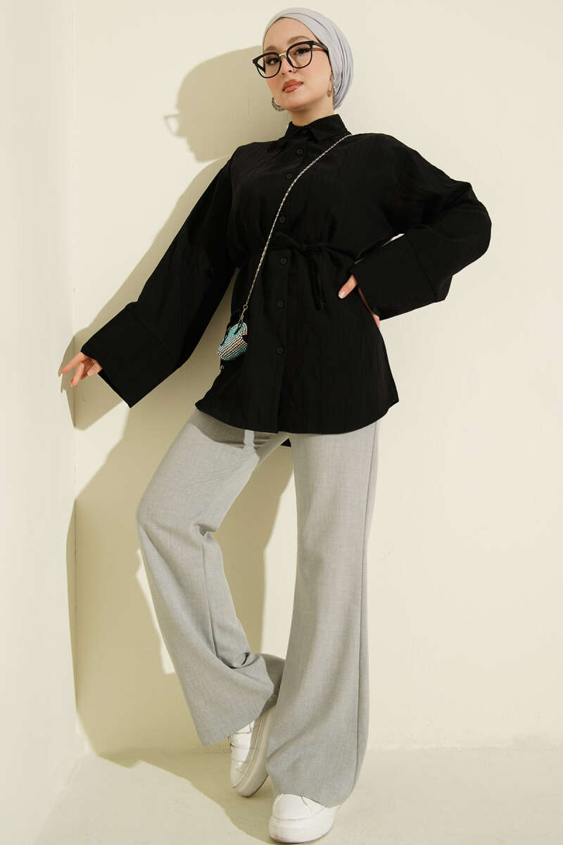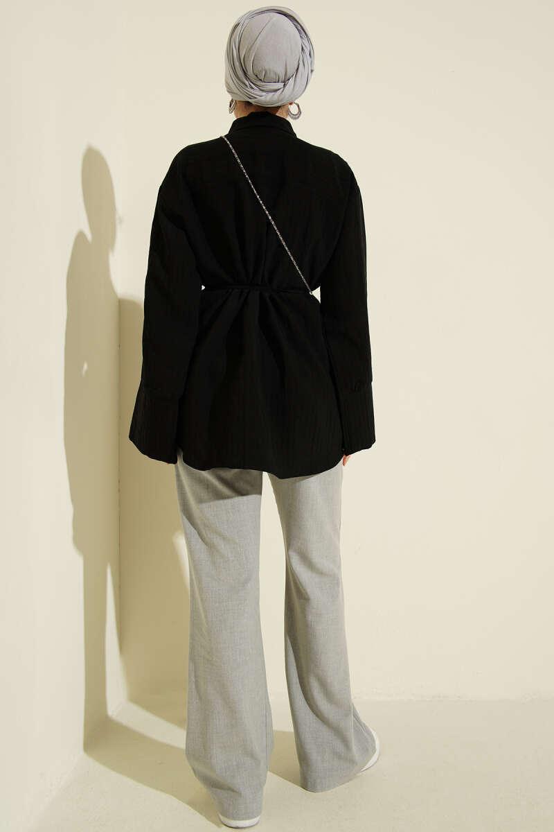 Brit Düğmeli İp Kuşaklı Tensel Gömlek Siyah