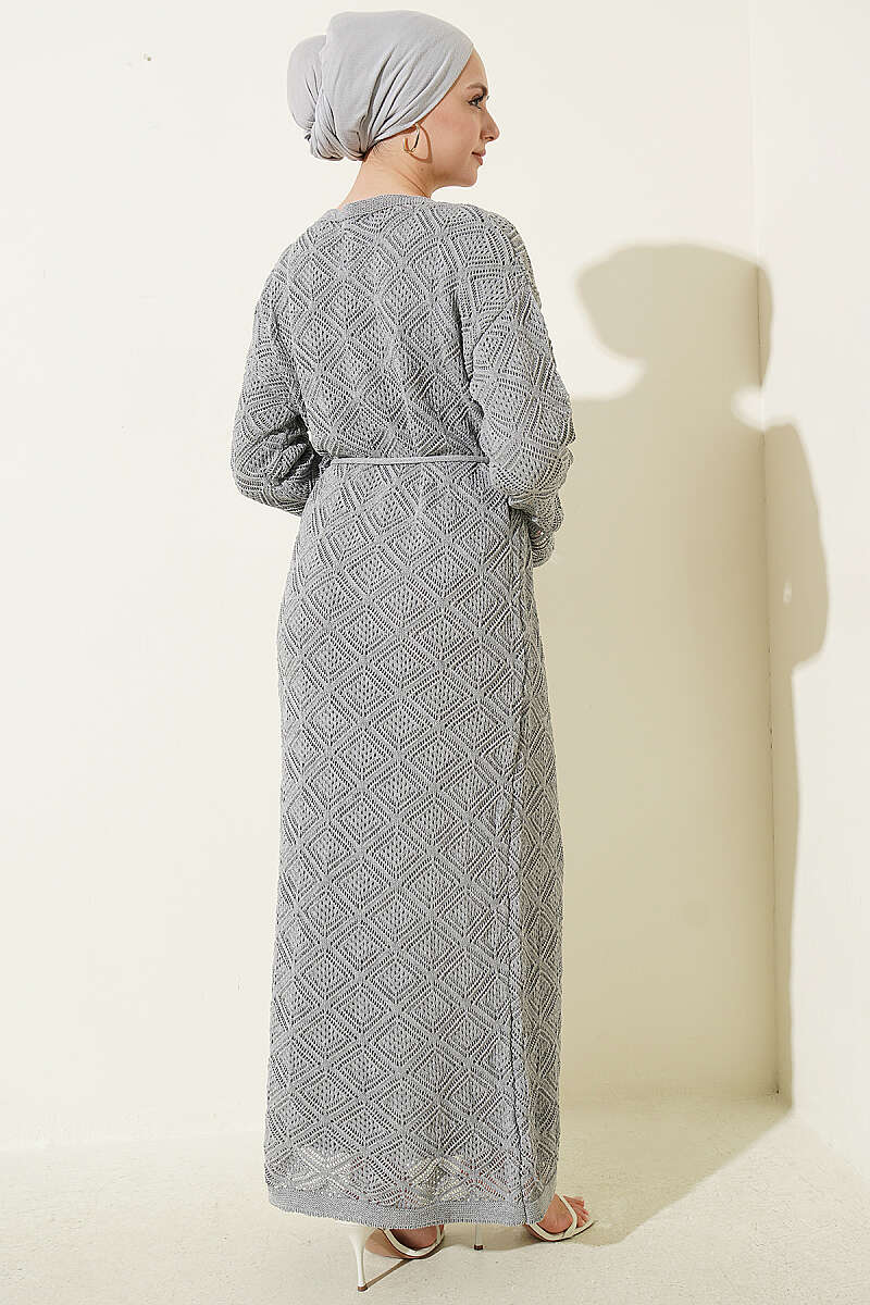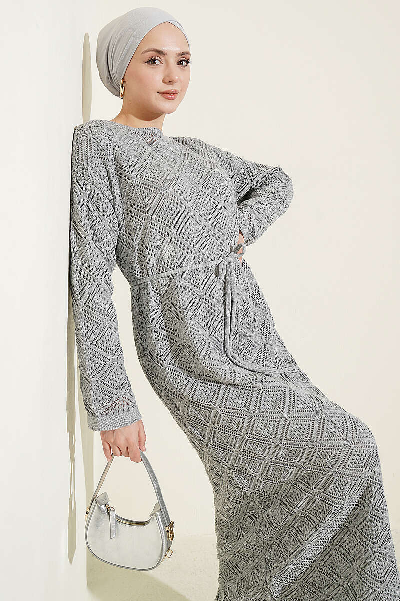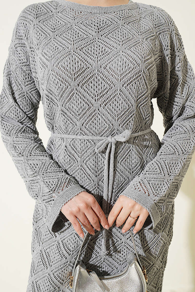 İp Kuşaklı Kare Ajurlu Triko Elbise Gri