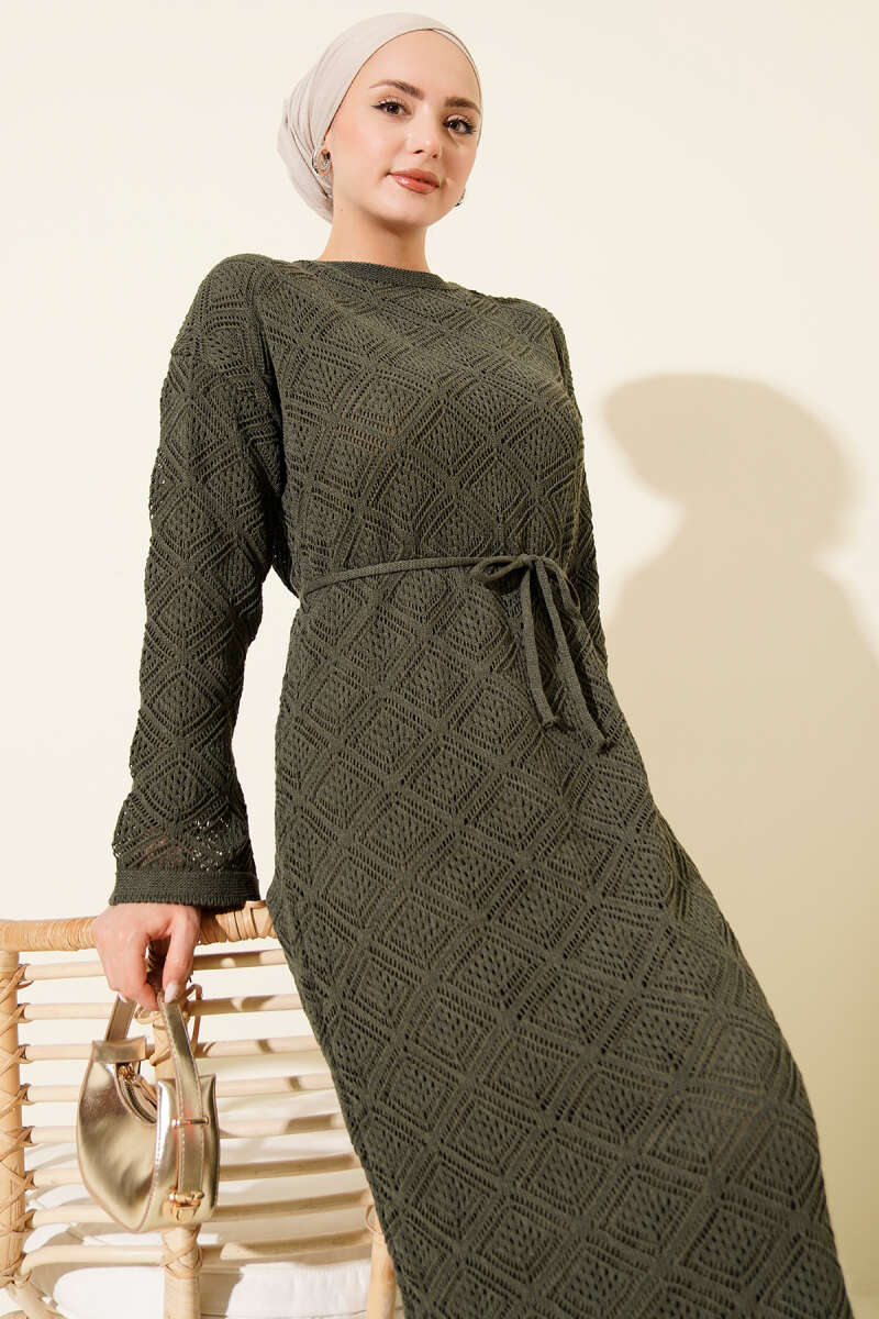 İp Kuşaklı Kare Ajurlu Triko Elbise Zümrüt