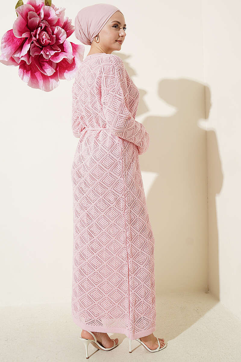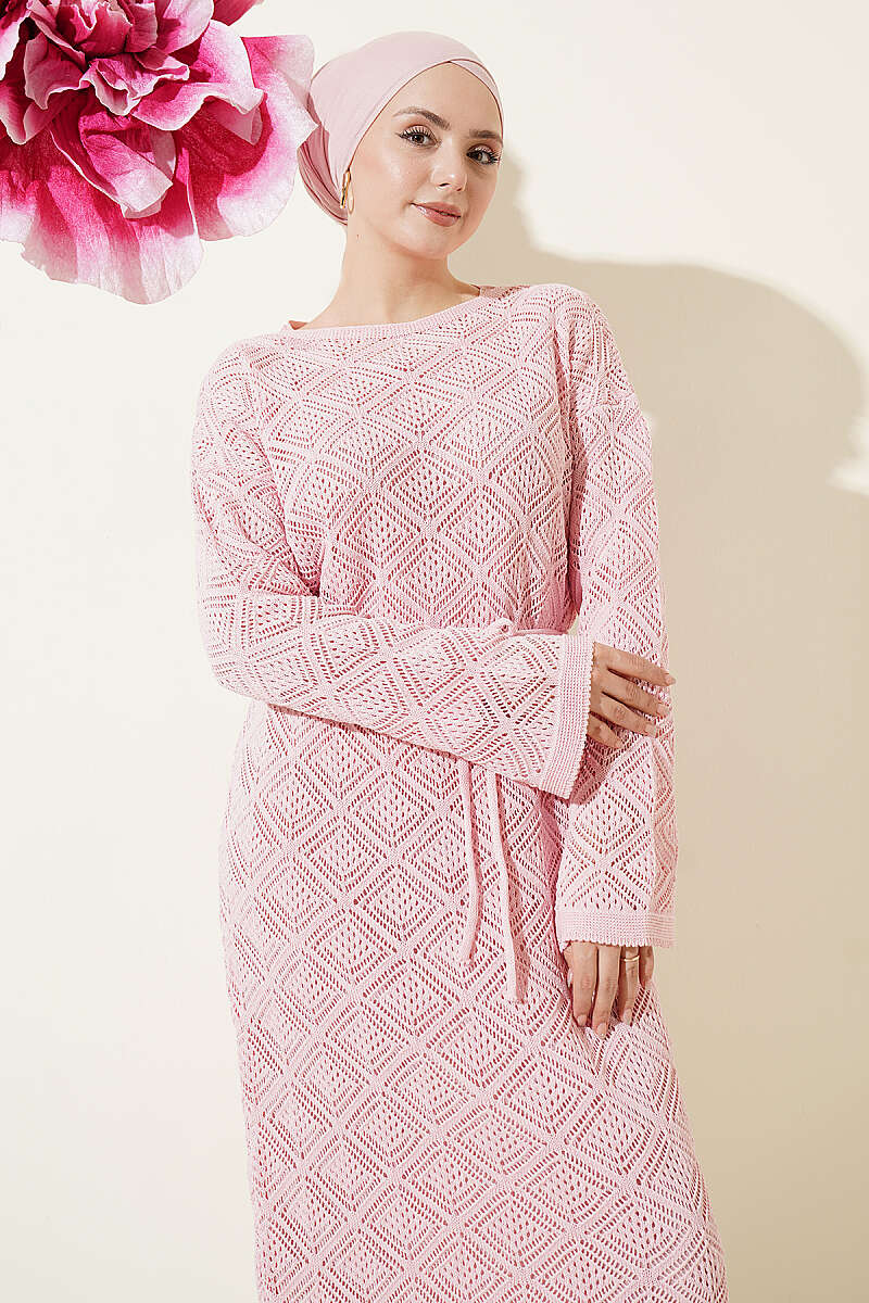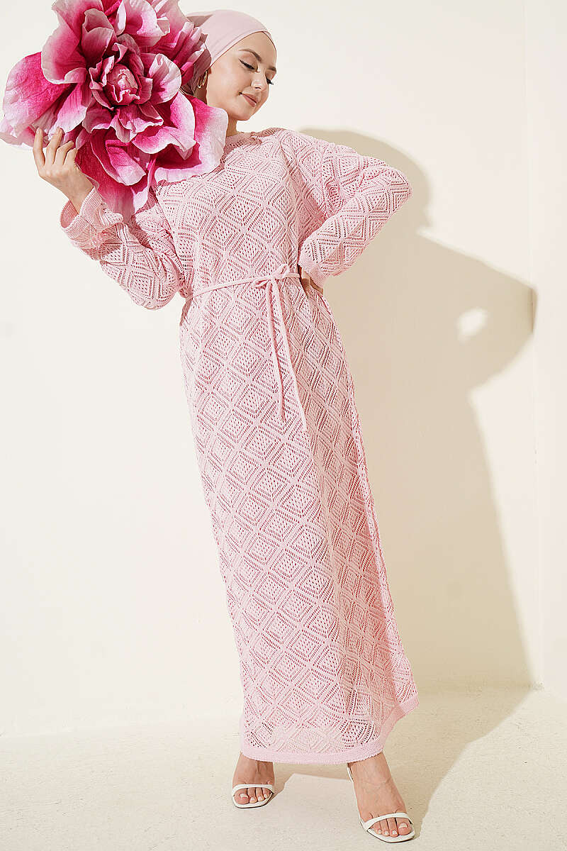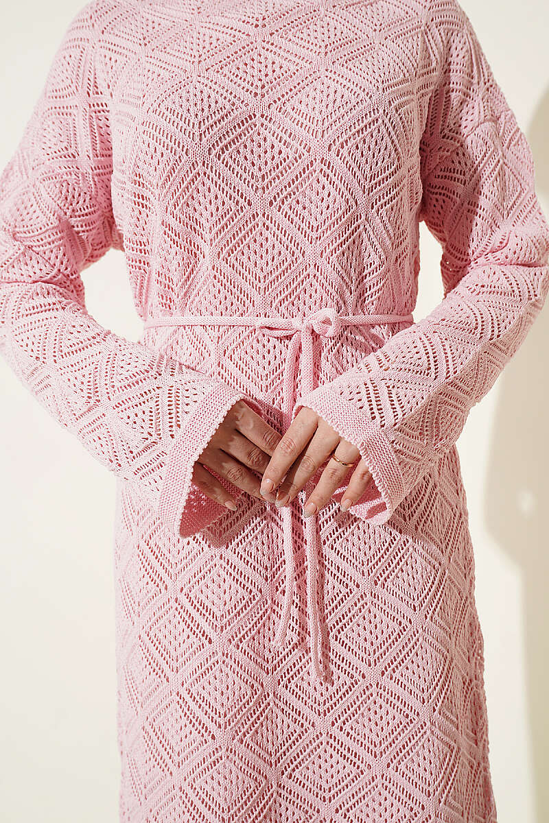İp Kuşaklı Kare Ajurlu Triko Elbise Pembe