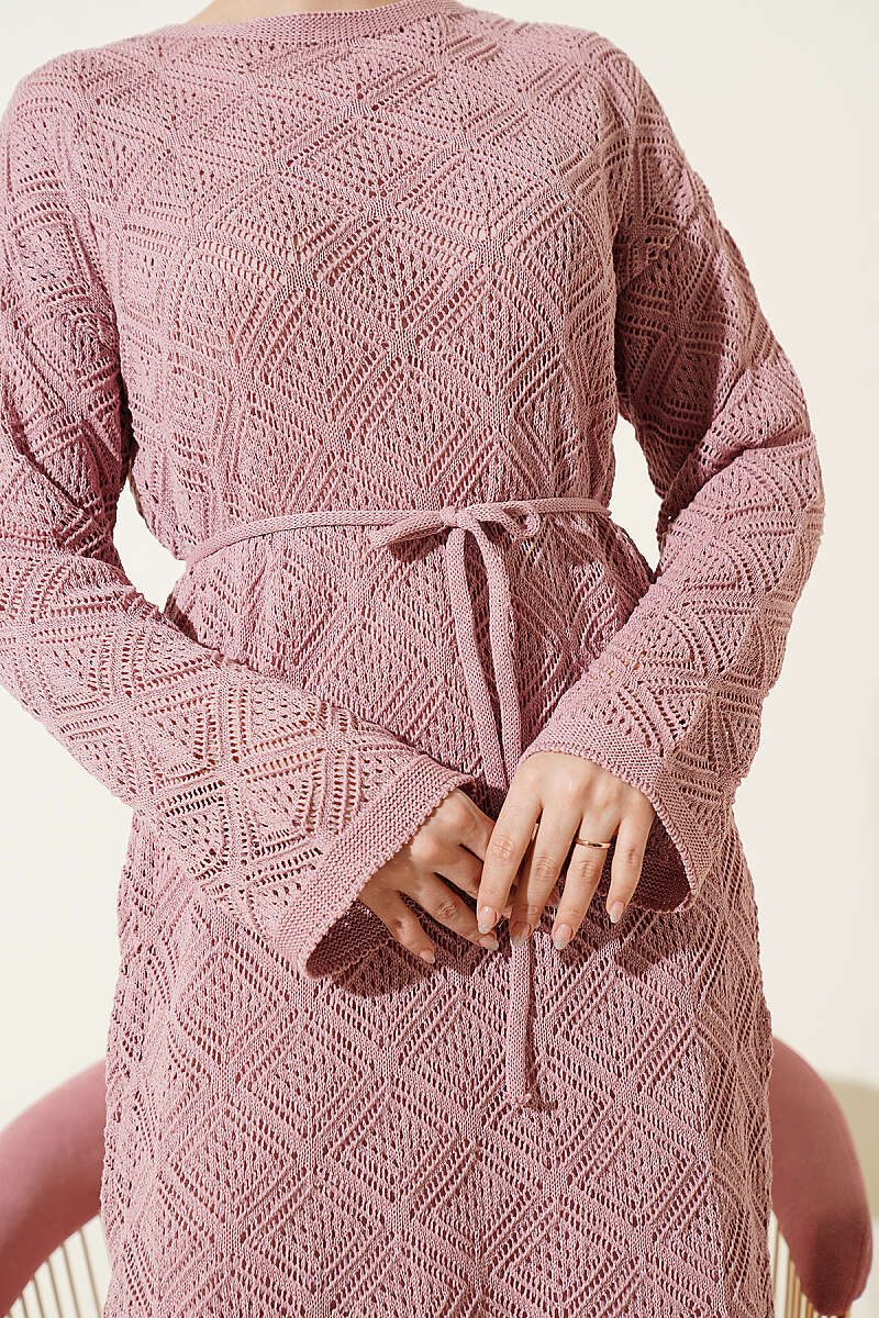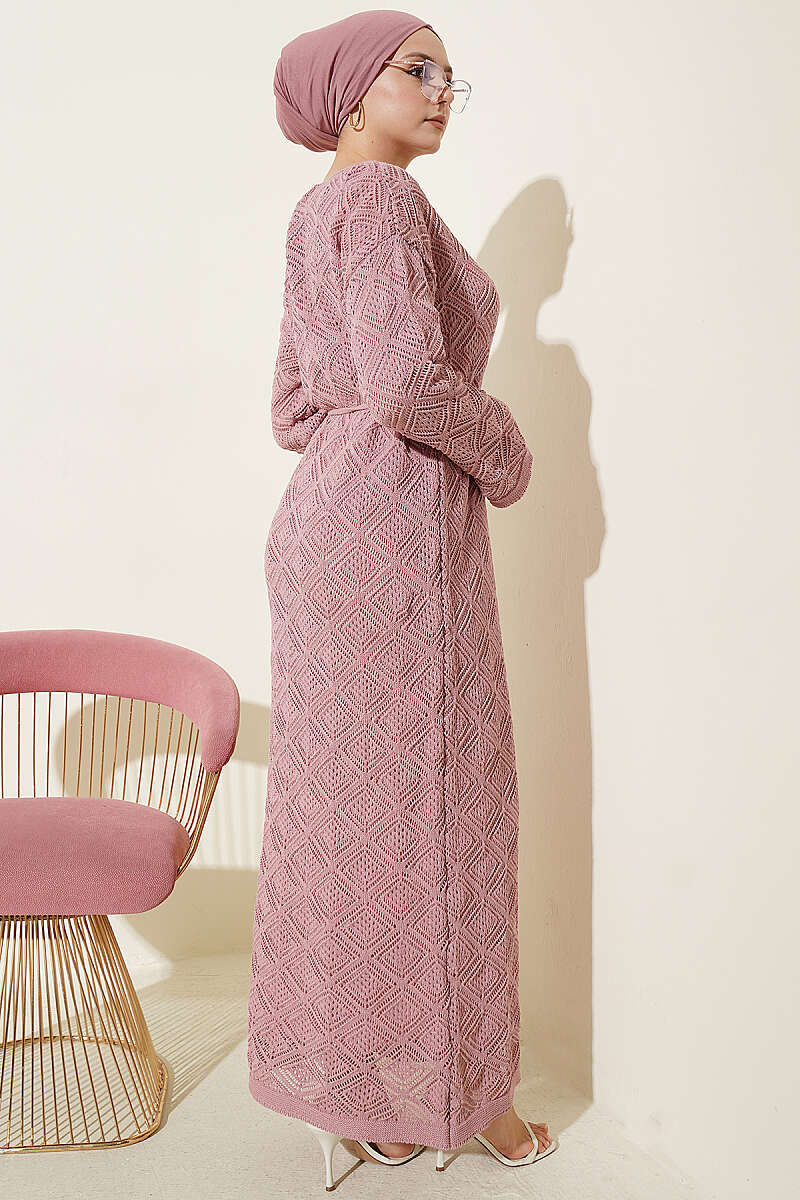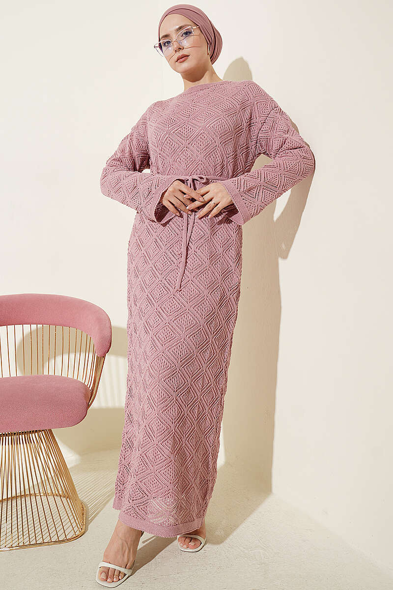 İp Kuşaklı Kare Ajurlu Triko Elbise Pudra