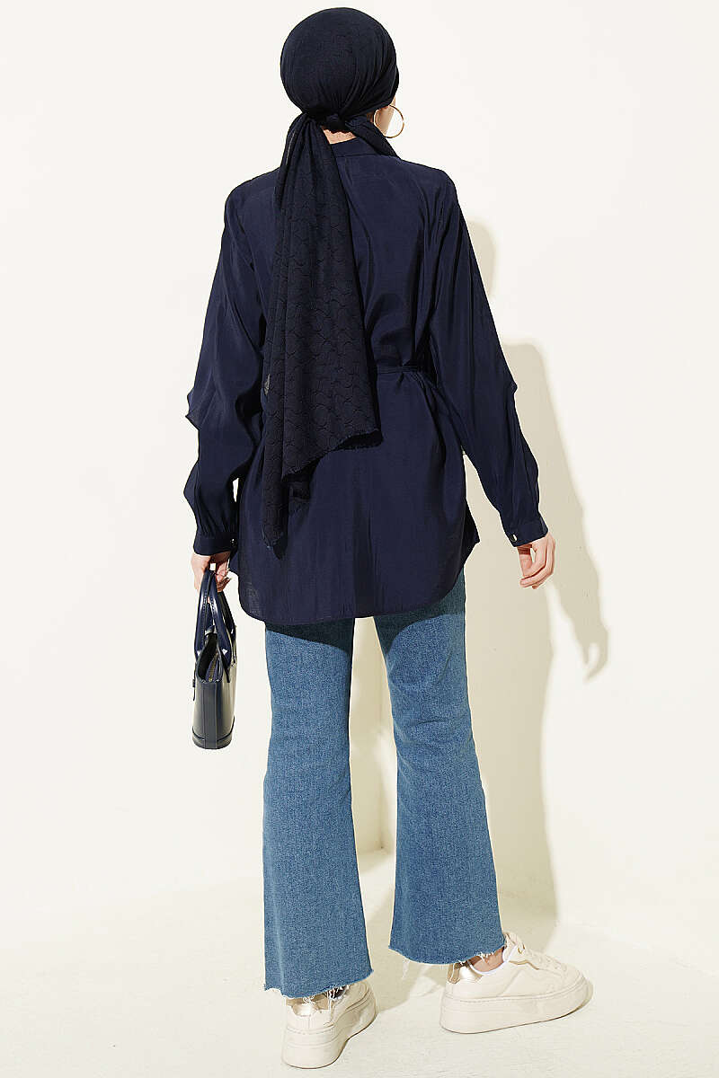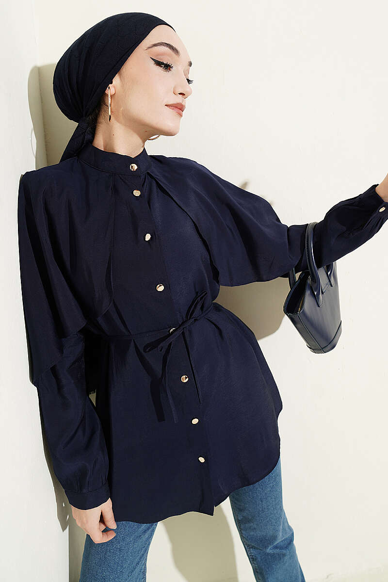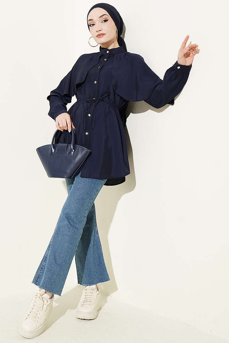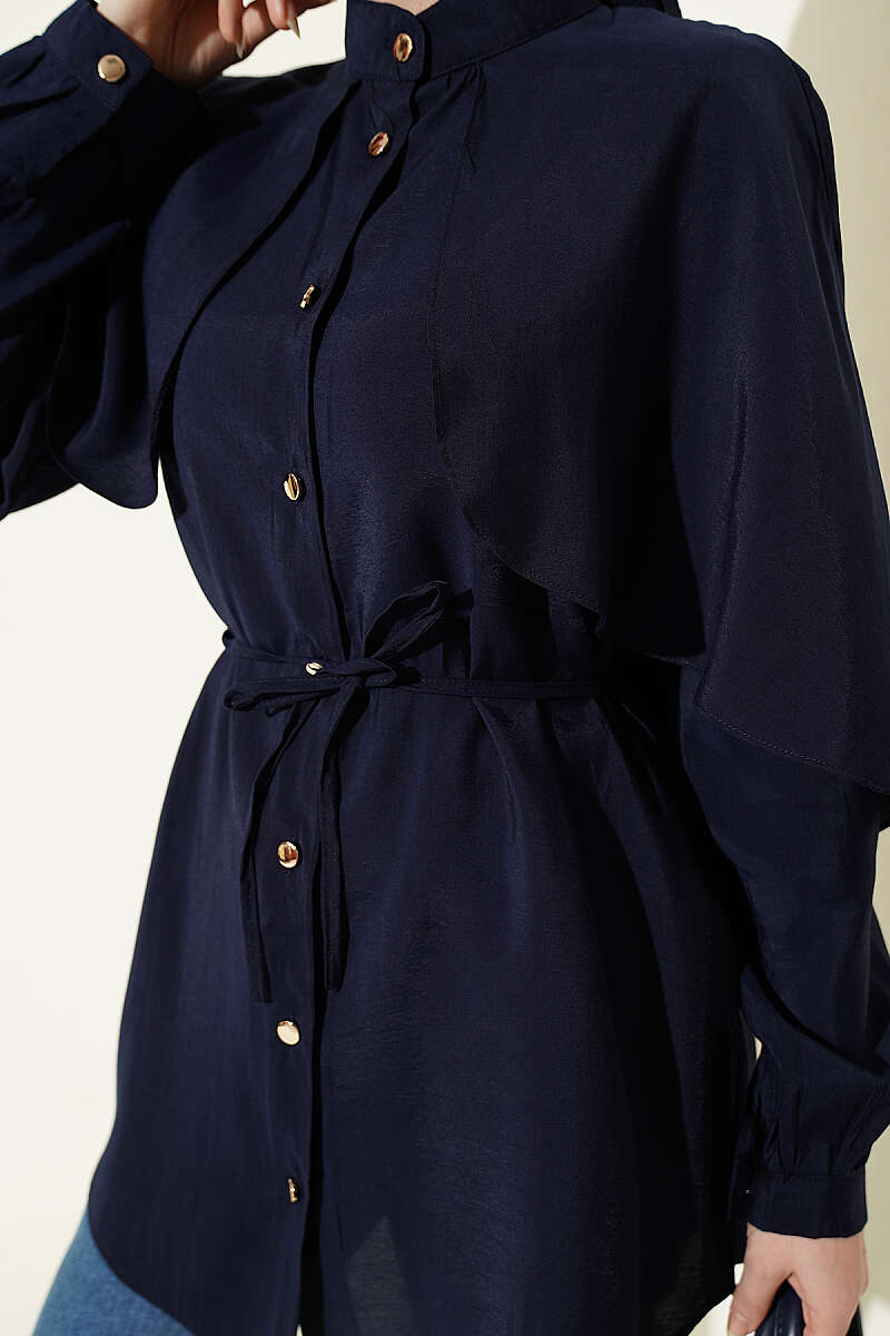 İp Kuşaklı Kol Pelerinli Gömlek Lacivert