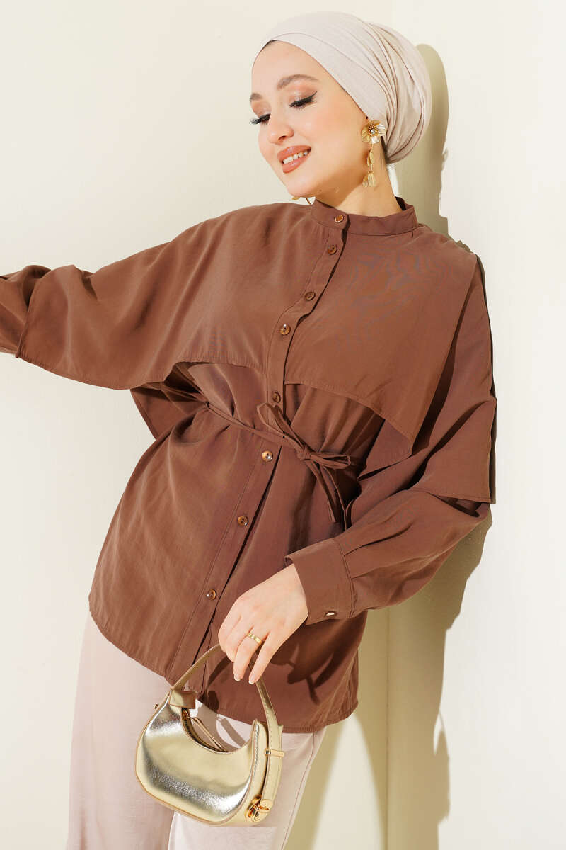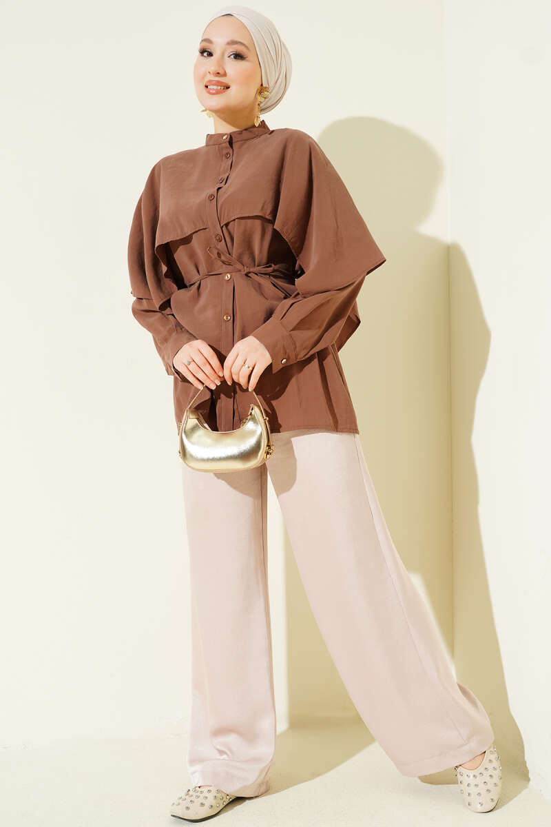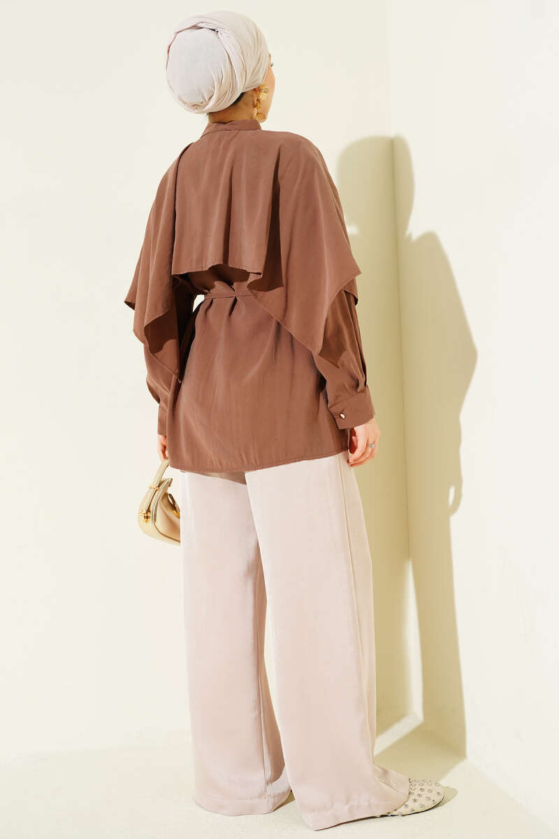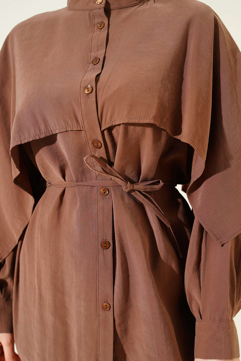 İp Kuşaklı Omuz Pelerinli Tencel Gömlek Kahve