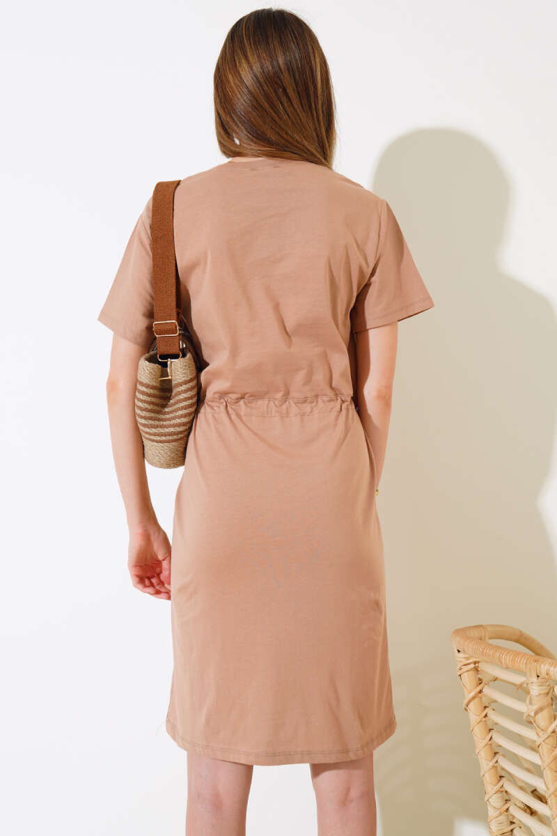 Gold Düğmeli Yan Çizgili Triko Hırka Bej Kahve