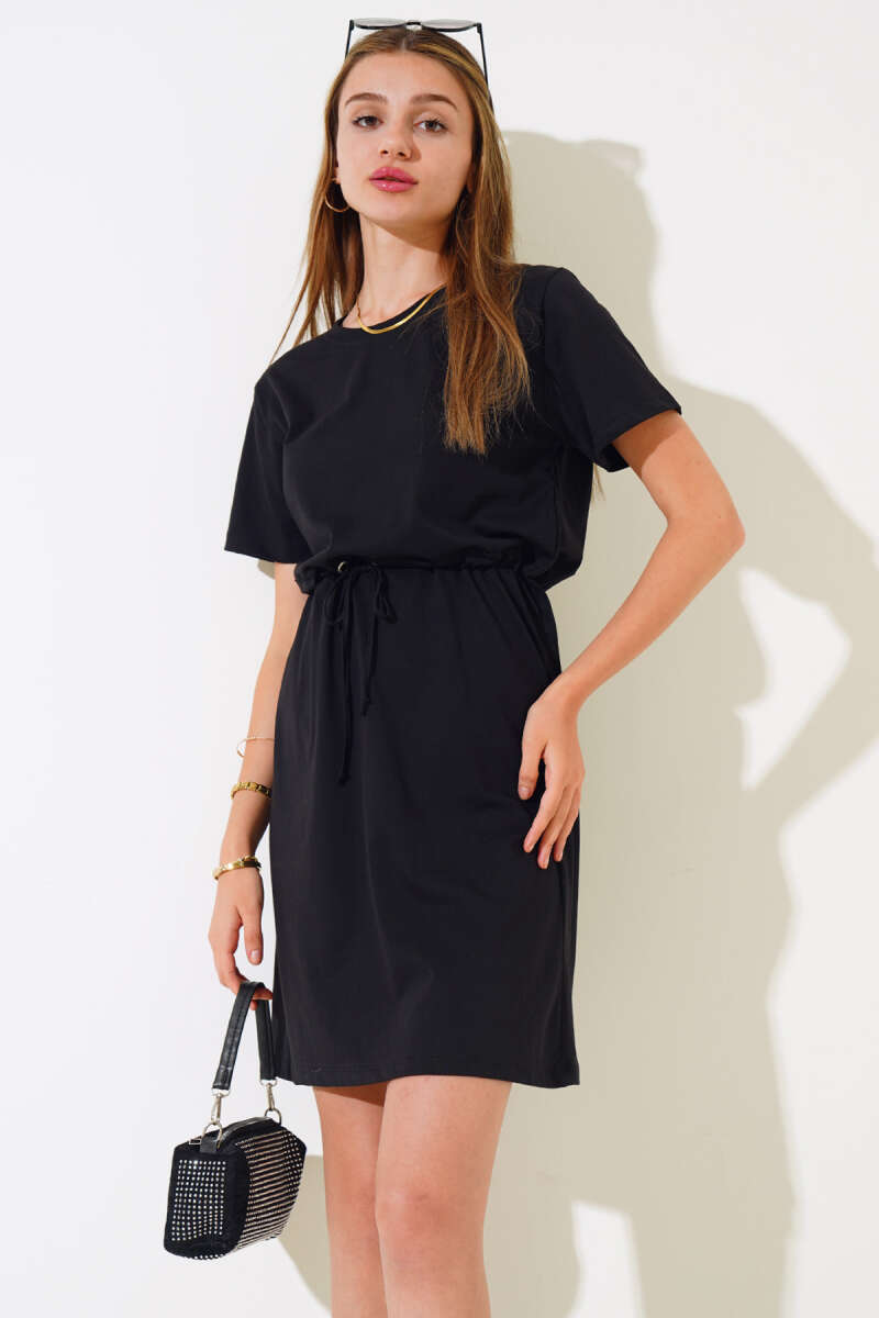 Bel Detaylı Degaje Yaka Kadife Elbise Siyah