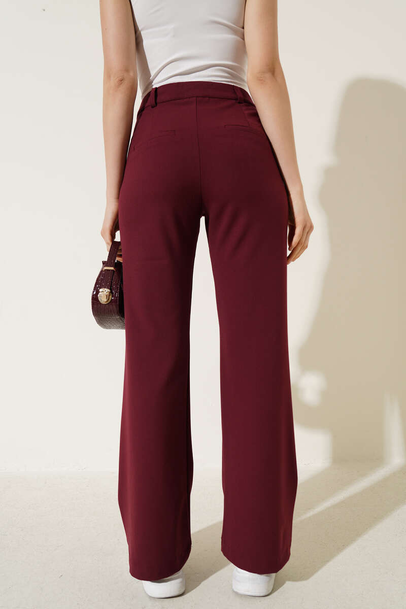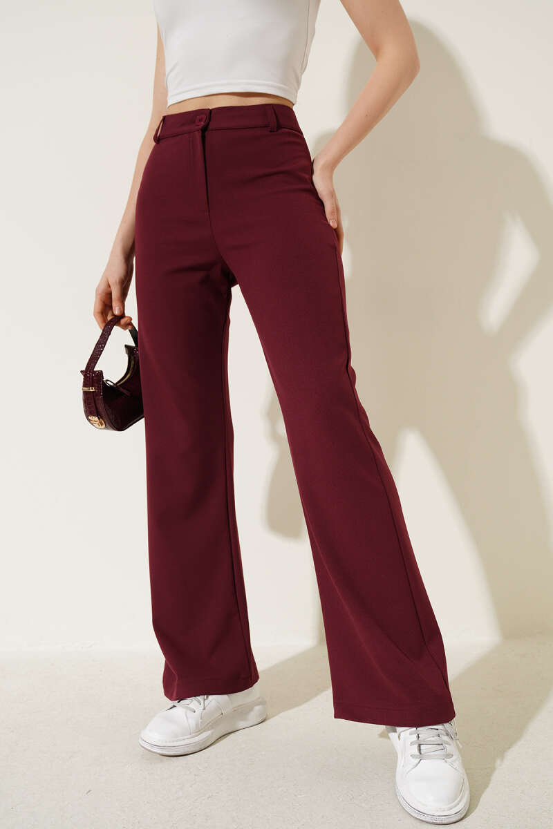 İspanyol Paça Bel Düğmeli Pantolon Bordo