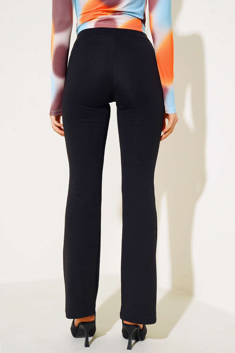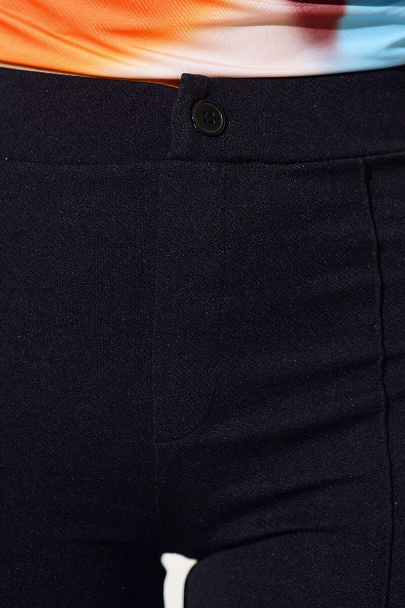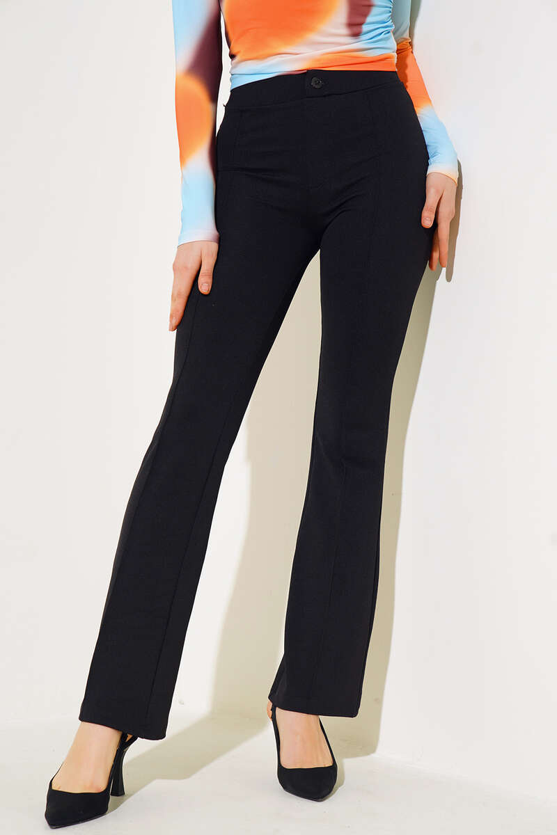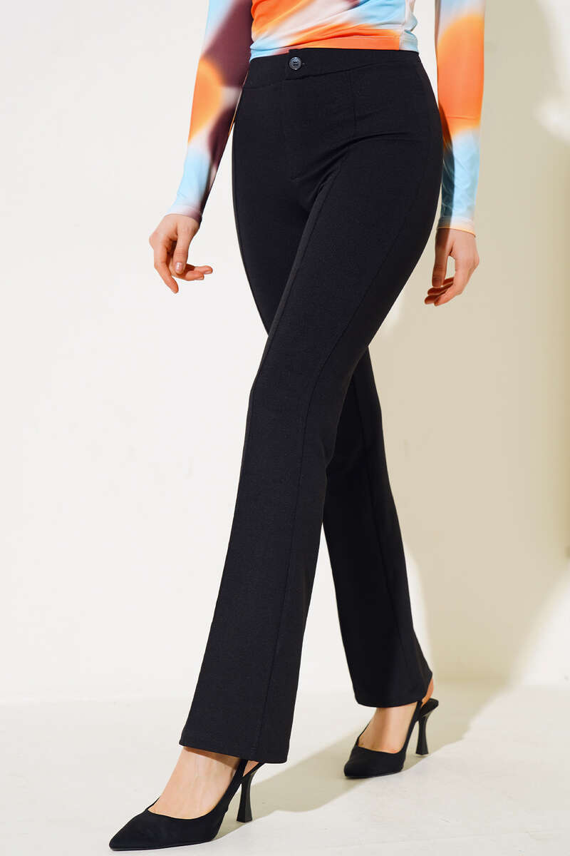 Yeni sezon pantolonumuz şıklığın zirvesinde. İspanyol paça olan pantolonumuz cepsiz modeldir. Düğmeli olan pantolon likralı yapısıyla esnemektedir. Kombinlerinizde şık bir dokunuş doğru tercihtir.
