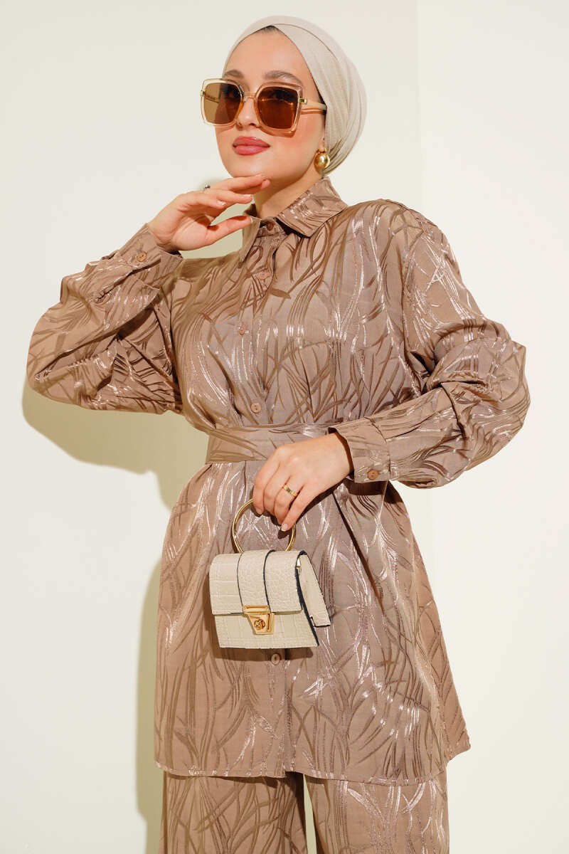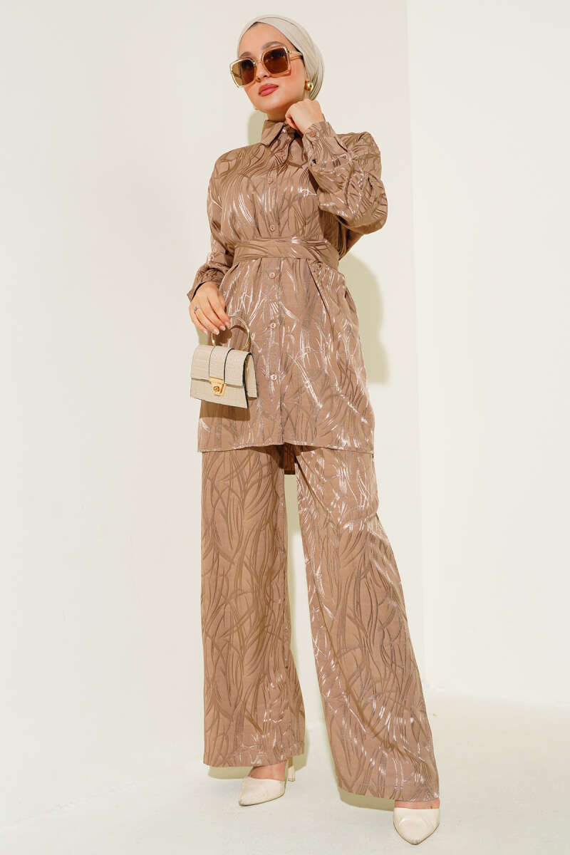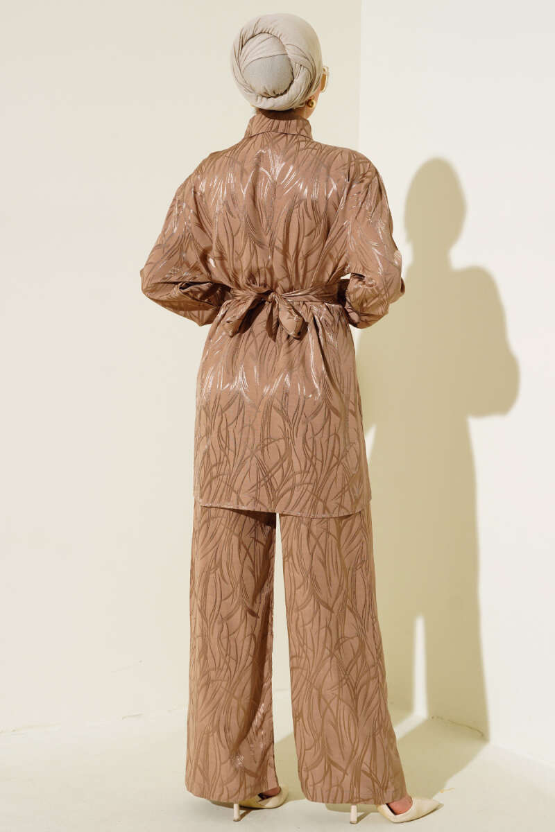 Taşlı Önü Bağlamalı Etekli İkili Takım Bej
