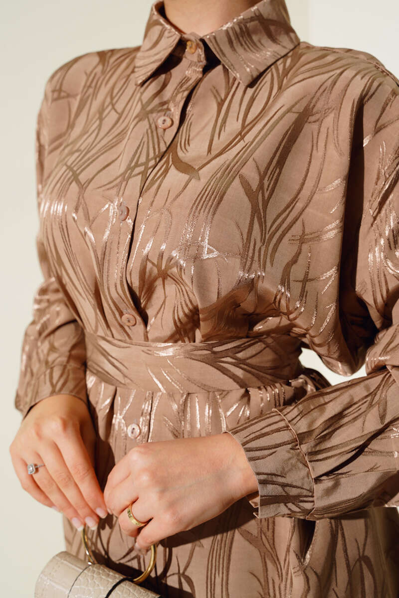 Yarım Düğmeli Çiçek Dantelli Elbise Saks