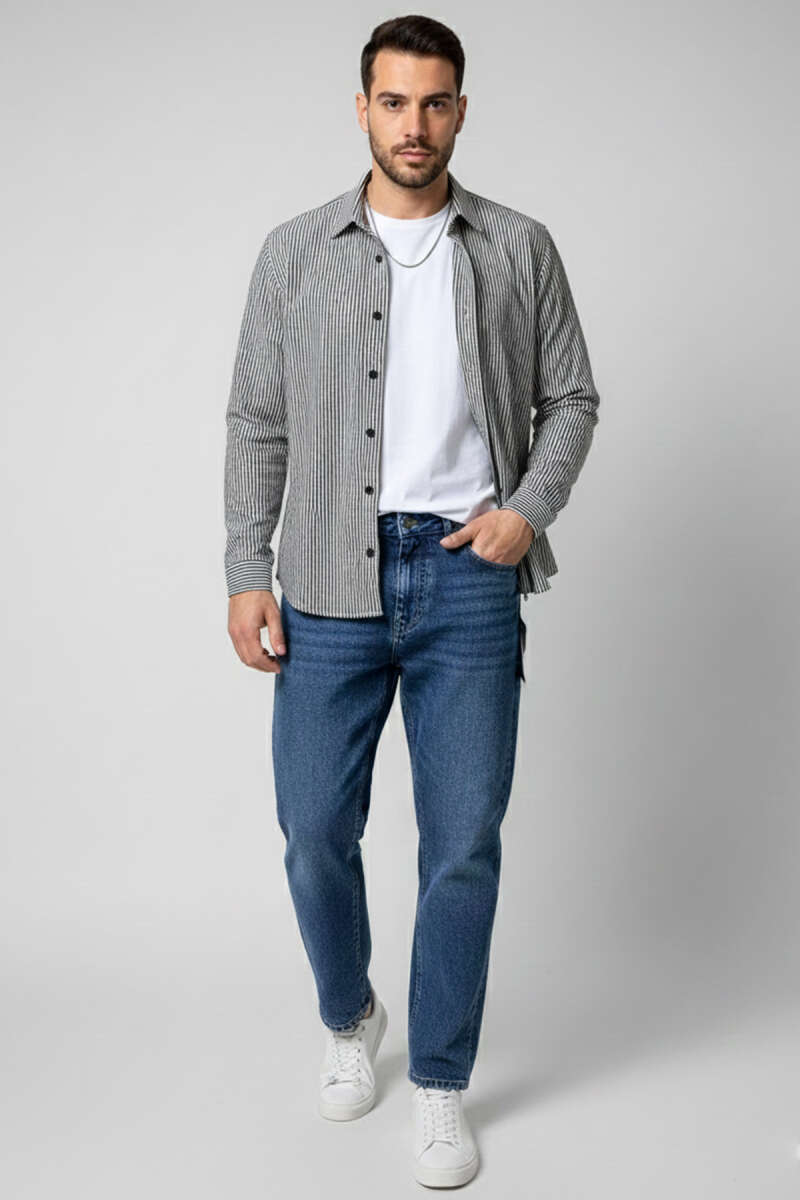 Jakarlı Çizgili Erkek Gömlek Siyah
