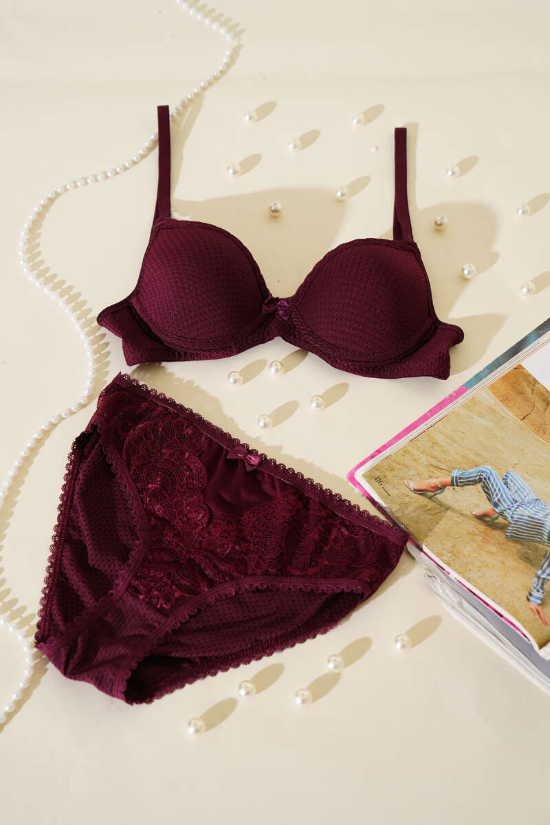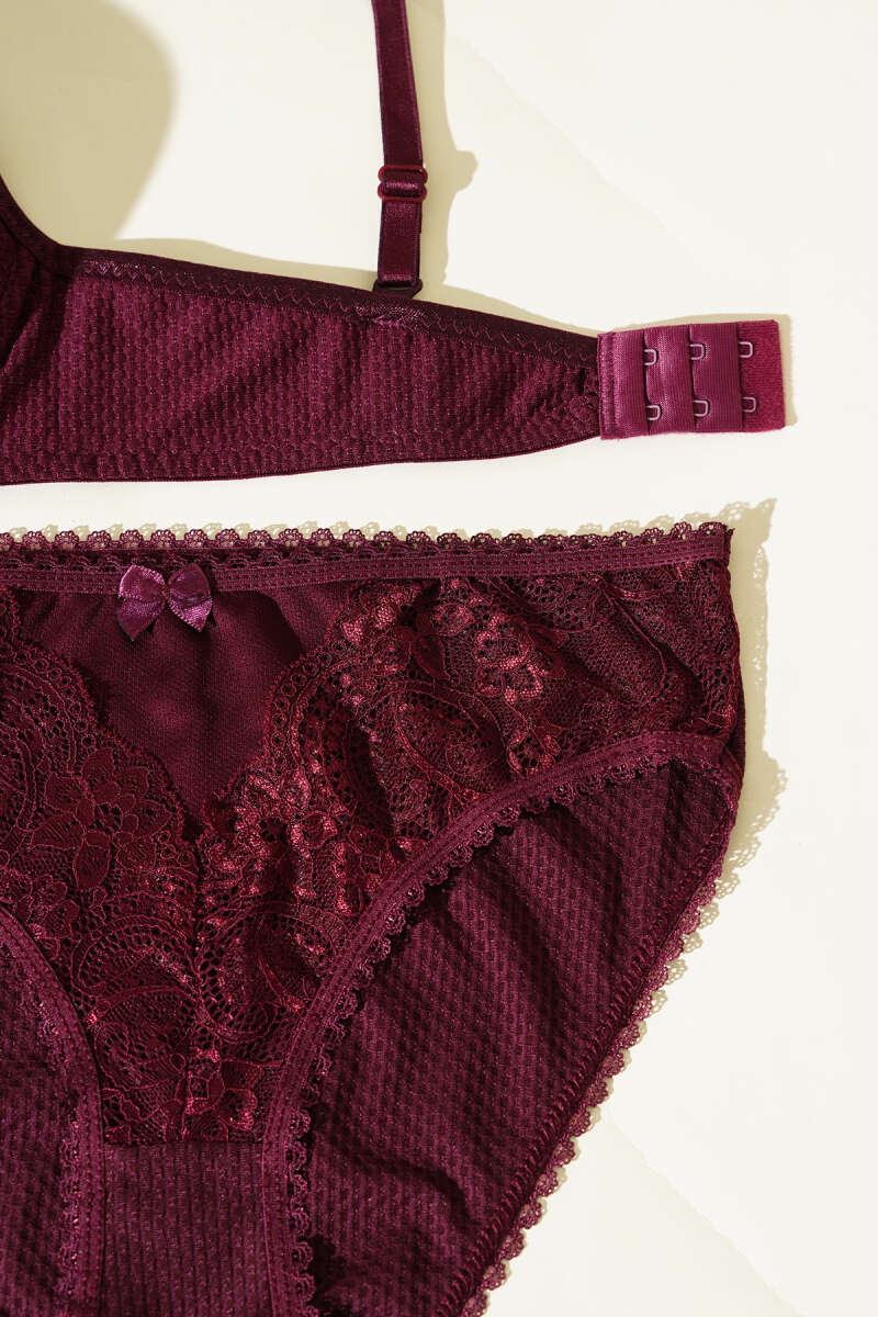 Jakarlı Dantel Detaylı Desteksiz Sütyen Takım Koyu Mürdüm