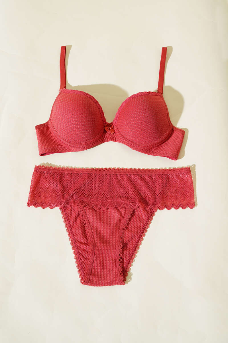 Jakarlı Dantel Detaylı Desteksiz Sütyen Takım Nar Çiçeği