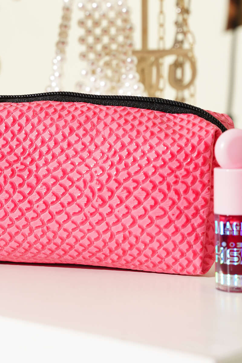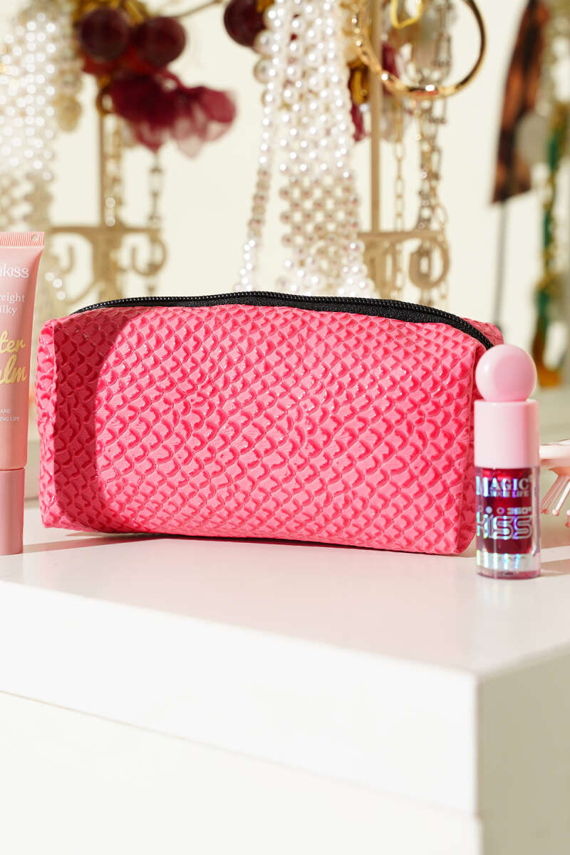 Jakarlı Fermuarlı Makyaj Çantası Fusya