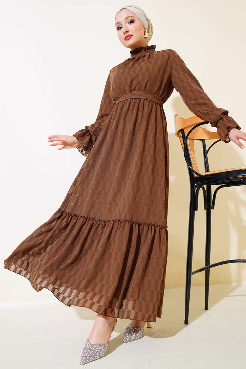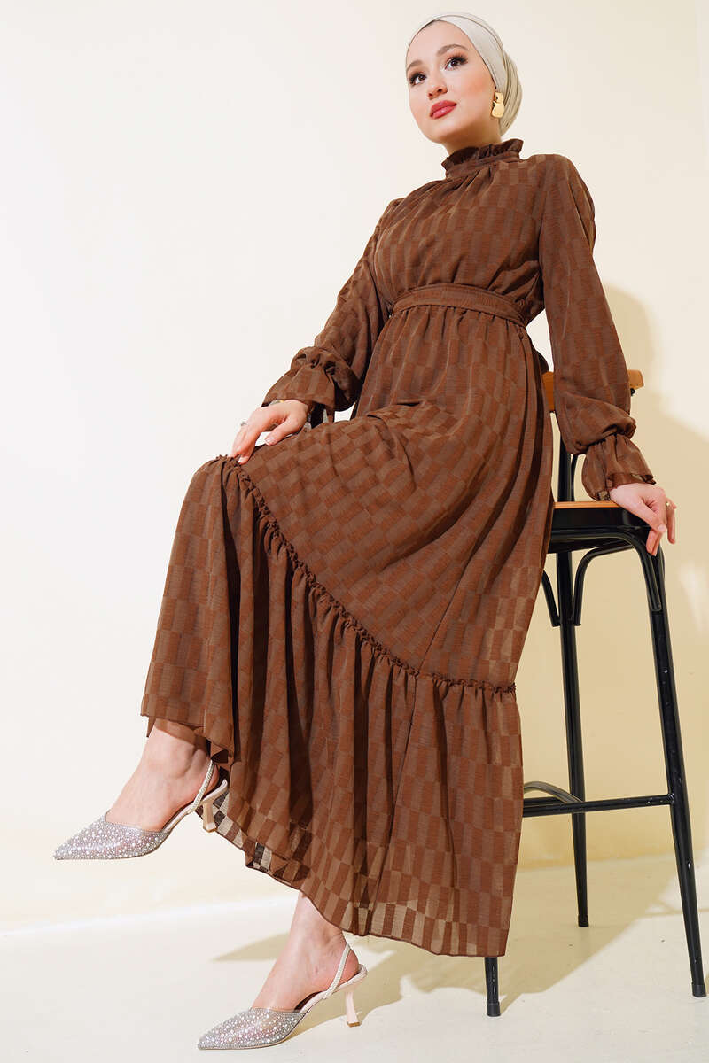 Şık elbisemiz size çok yakışacak. Elbisemiz dama deseniyle şıklık kazanmıştır. Beli ve kol bileği lastiklidir. İki adet kemer köprüsü olup, kendi kumaşından kuşağı vardır. Astarlıdır. Zarif tasarımlı elbisemiz dolabınızda yerini beklemektedir. Renk seçenekleri mevcuttur.