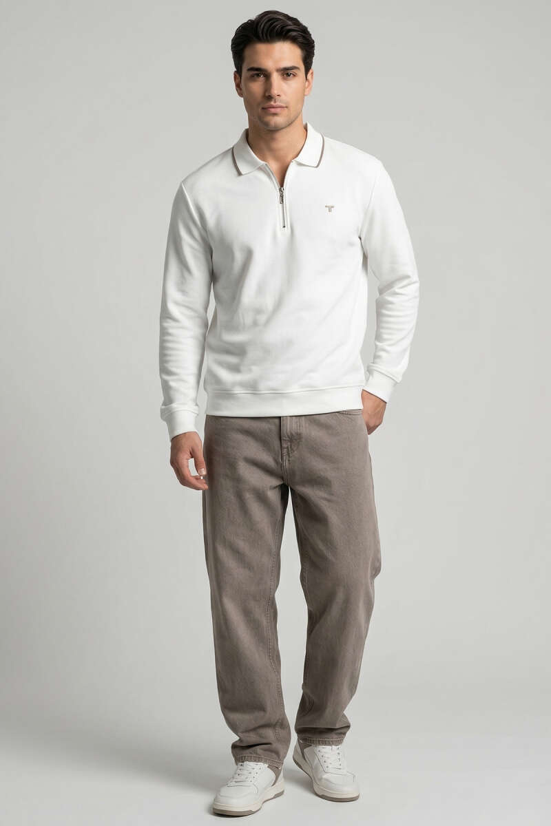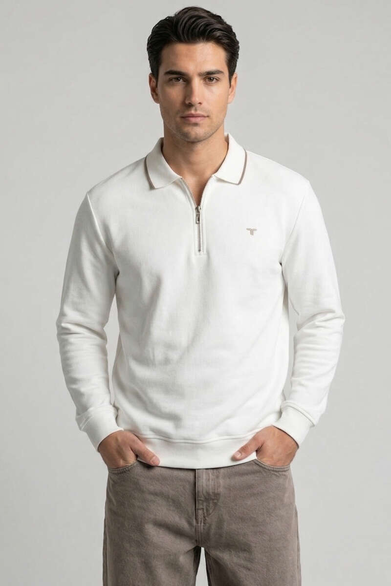 Jakarlı Polo Yaka Fermuarlı Erkek Sweatshirt Beyaz