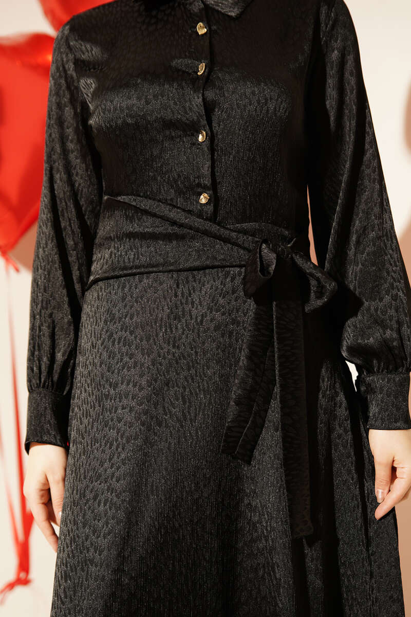 Boydan Düğemli Kemerli Brode Elbise Siyah
