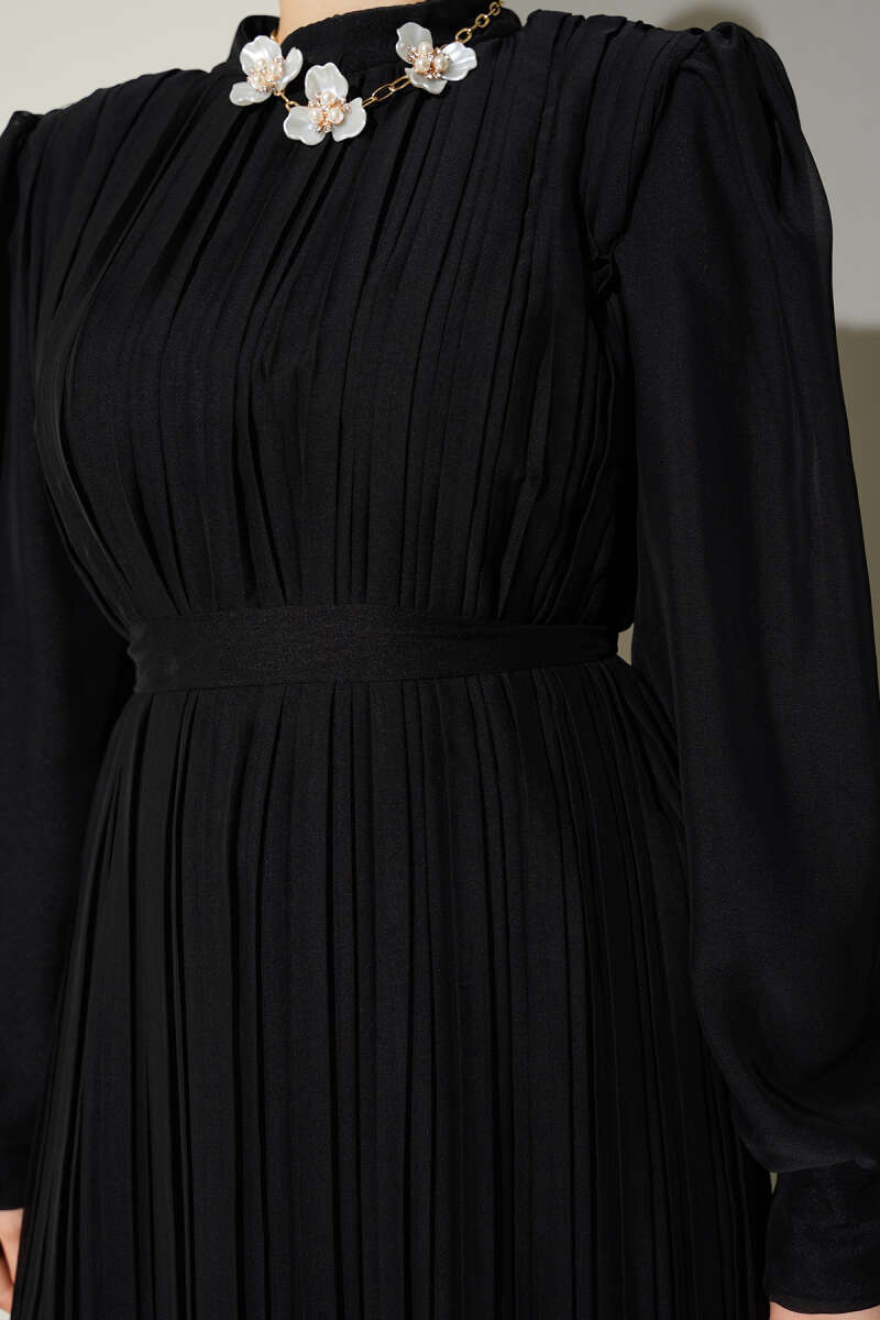 Taş Süslemeli Kuşaklı Jakar Elbise Siyah