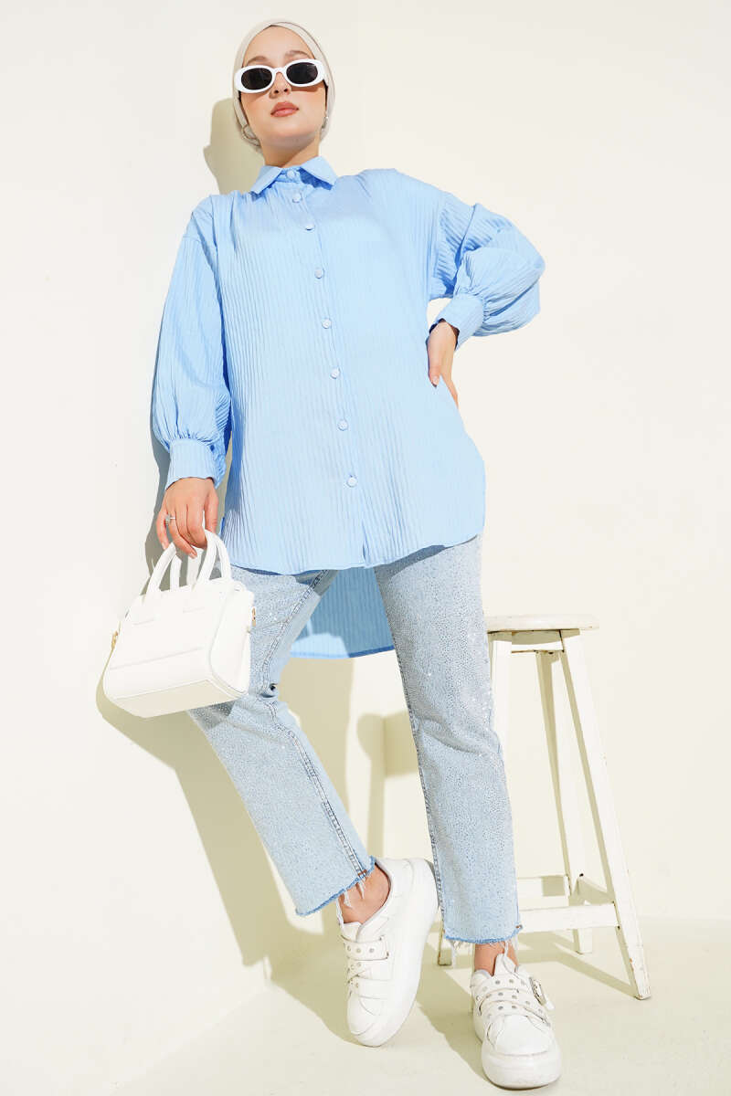 Gizli Düğmeli Bel Kuşaklı Gömlek Bebe Mavi