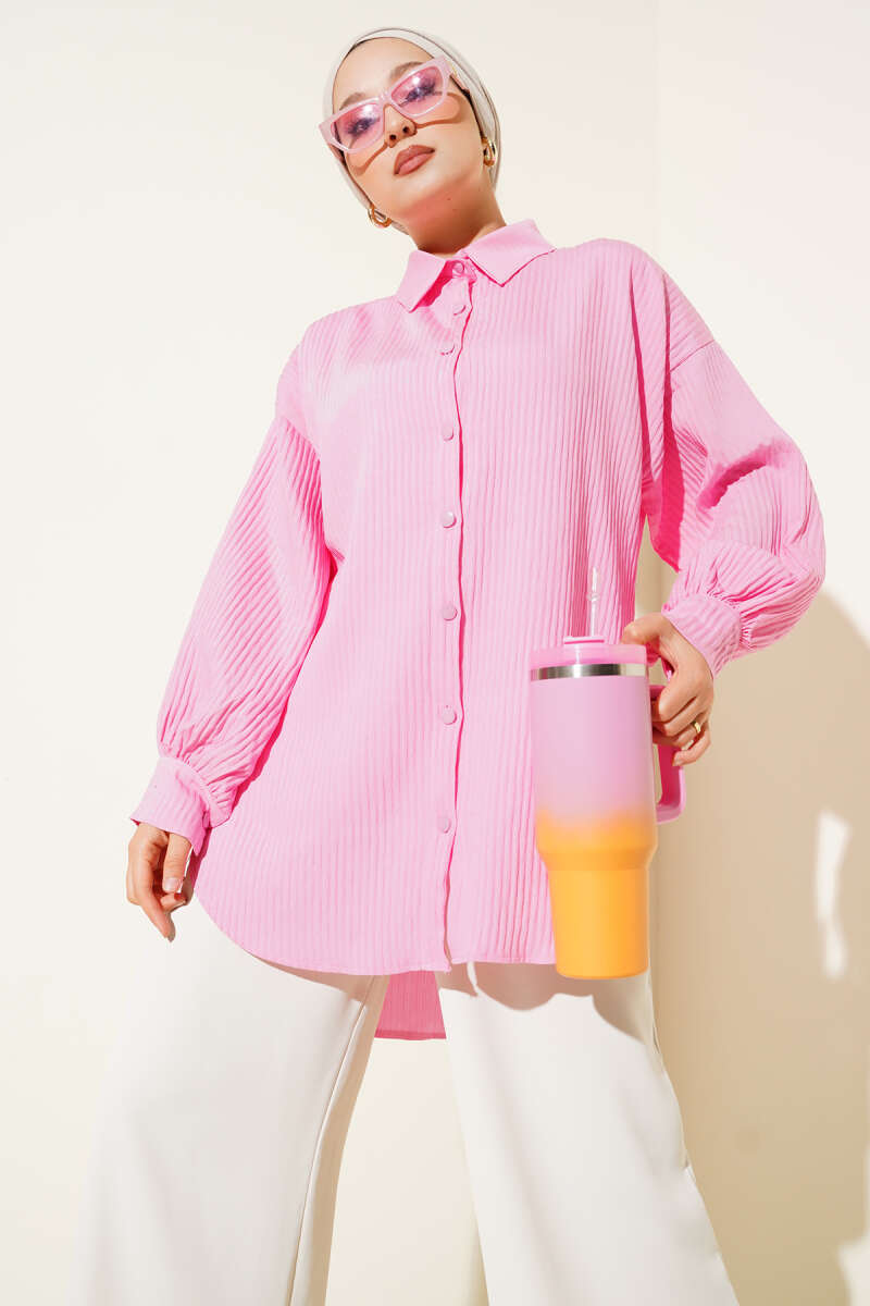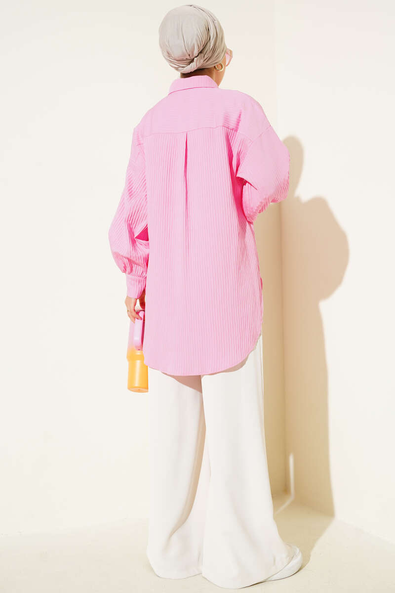 Kabartma Çizgili Bilek İpli Gömlek Pembe
