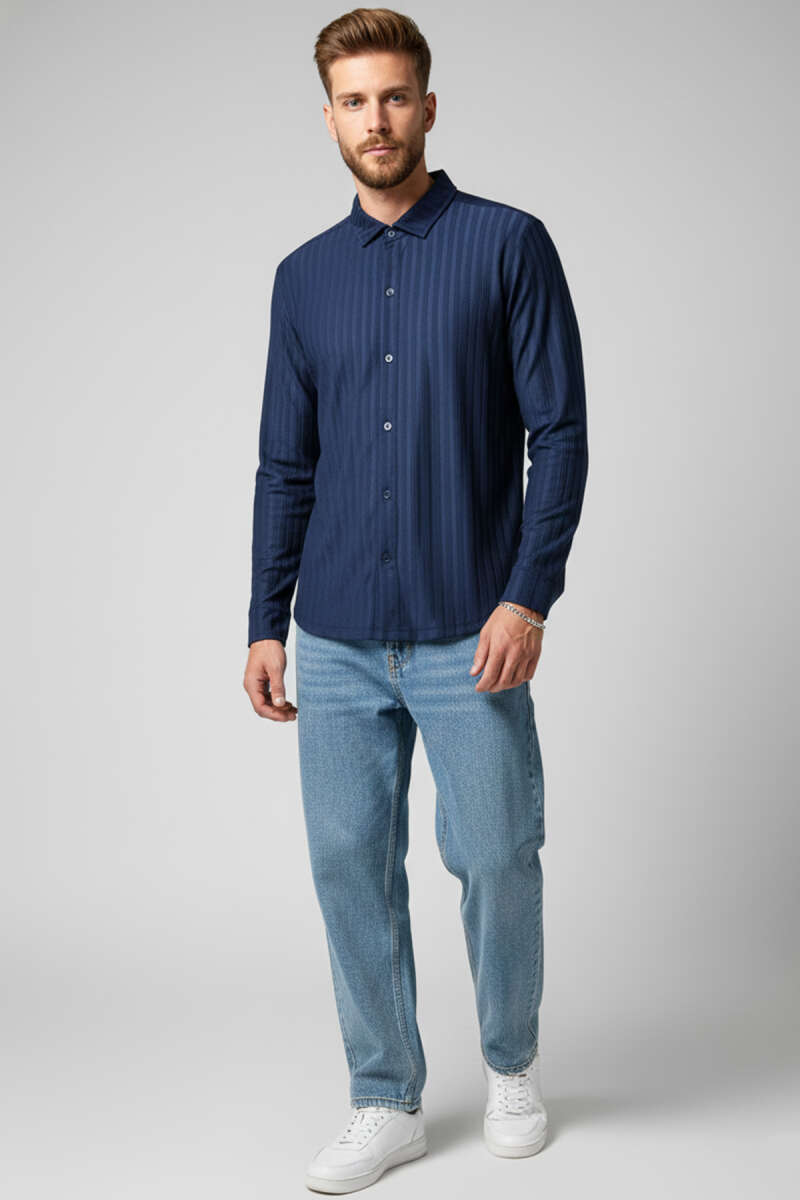 Jakar Desenli Dik Çizgili Erkek Gömlek Lacivert