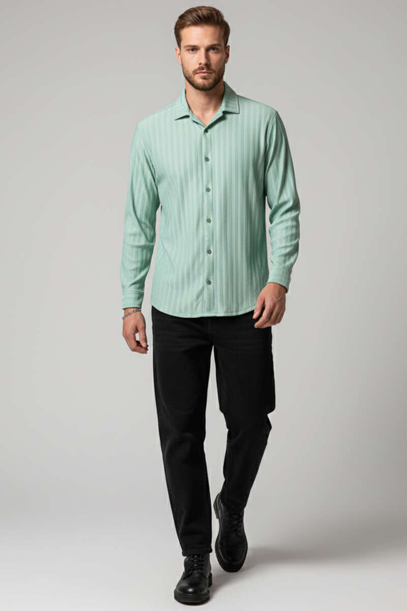 Kabartma Çizgili Jakar Erkek Gömlek Ekru