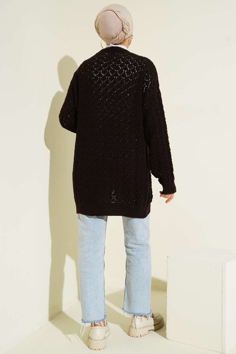 Baklava Desen Düğmeli Triko Hırka Kahve