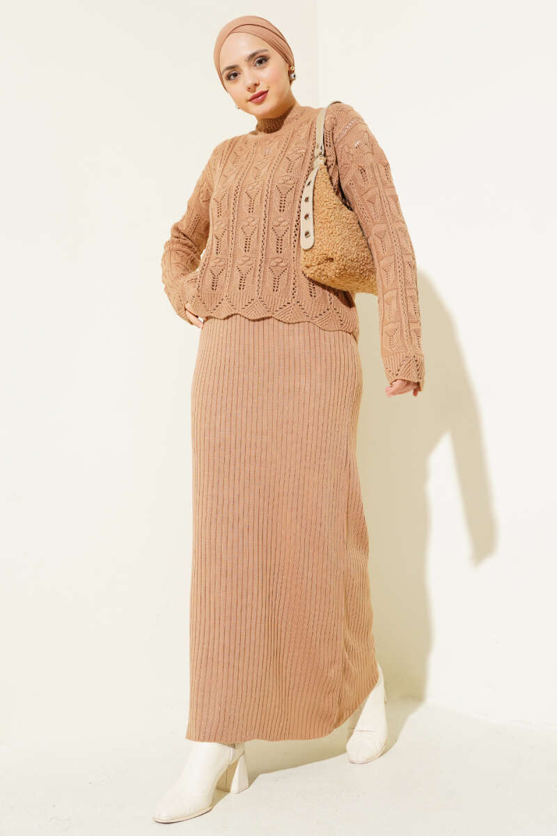 Taşlı Baklava Desen Triko İkili Takım Kahve