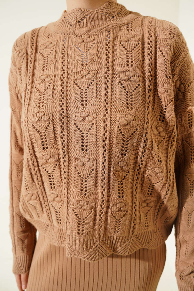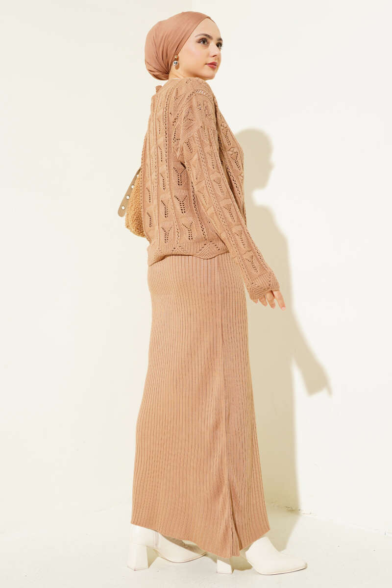 Kabartma Desen Triko Jile Elbise Takım Latte