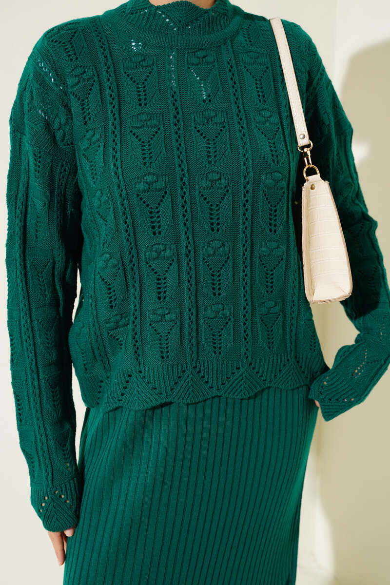 Taşlı Baklava Desen Triko İkili Takım Zümrüt