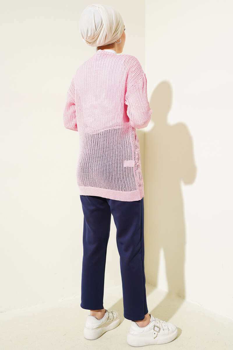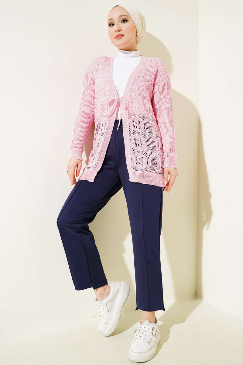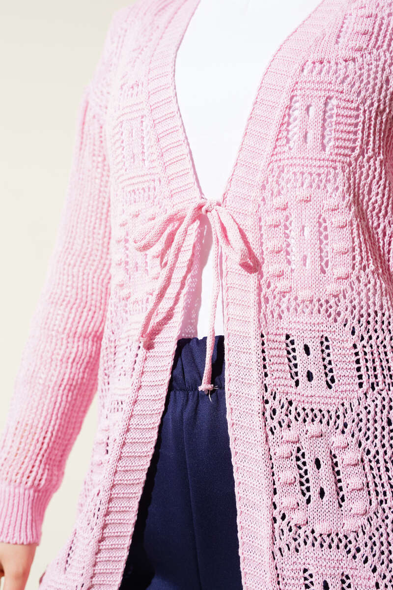 Kabartma Desenli Bağcıklı Triko Hırka Pembe