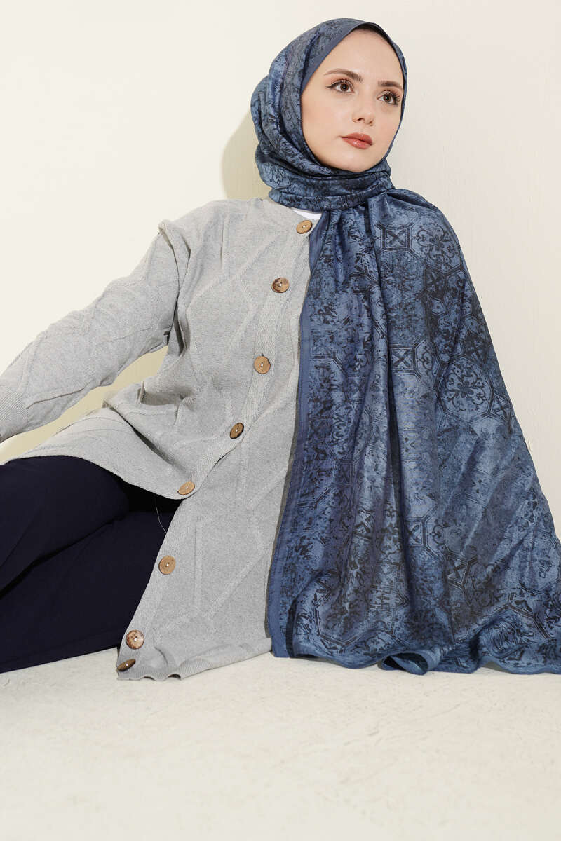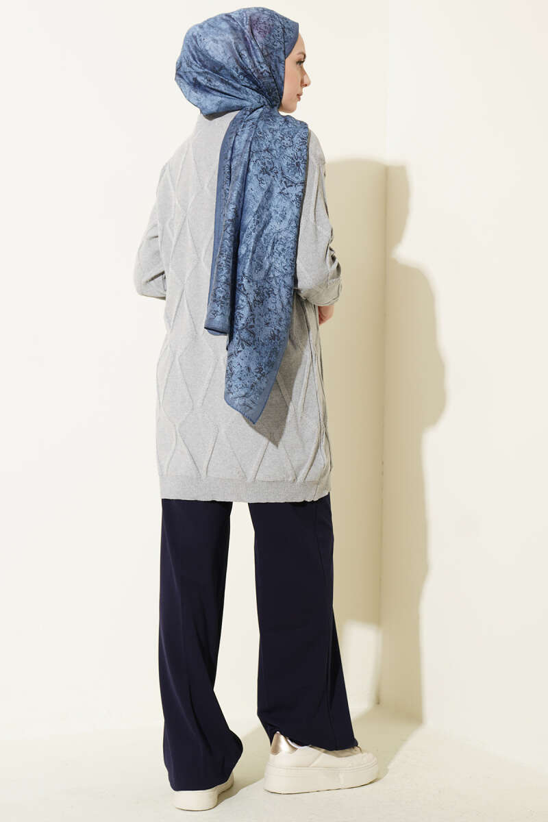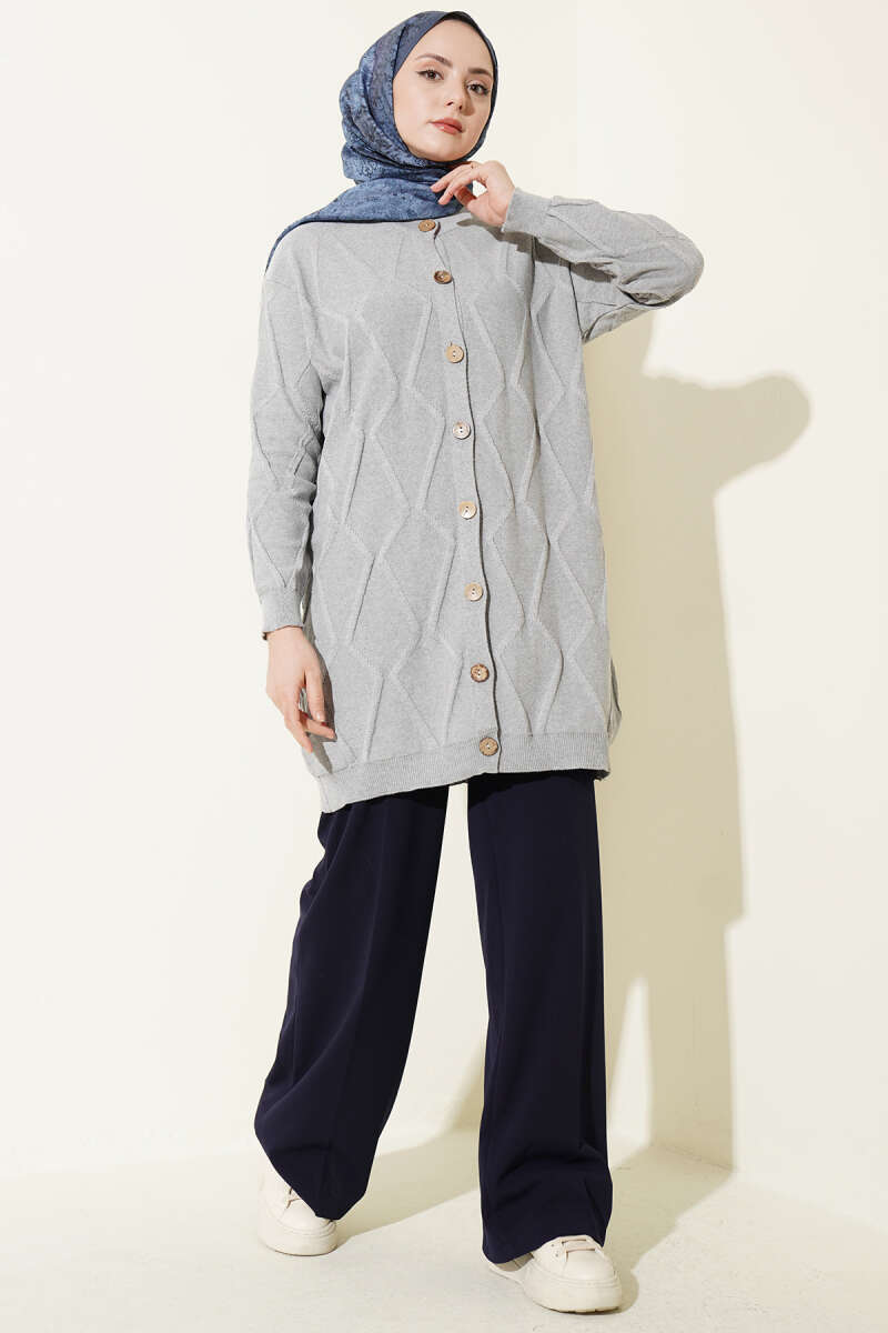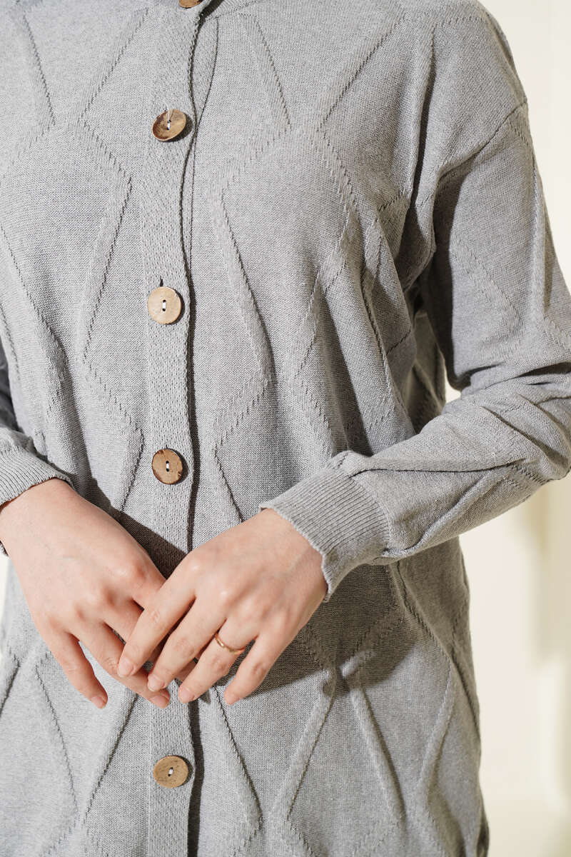 Kabartma Desenli Düğmeli Triko Hırka Gri