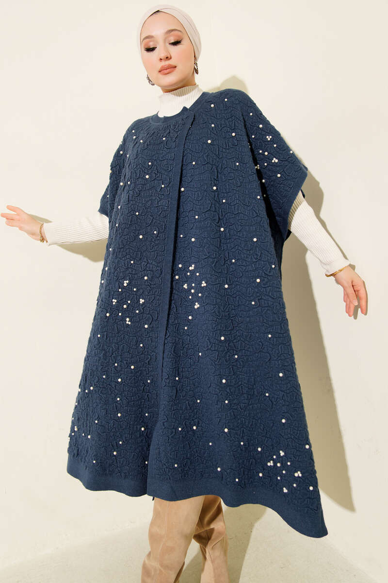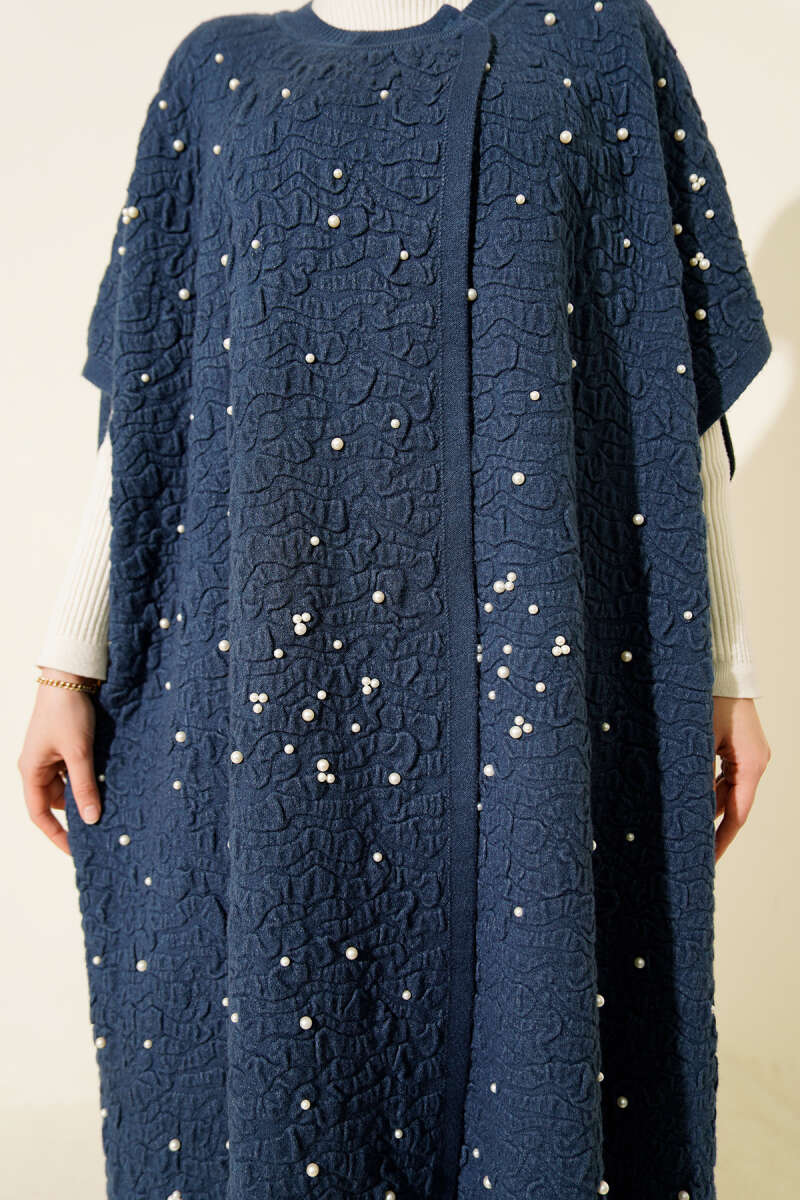 Kilim Desen Kapüşonlu Panço Siyah Mavi