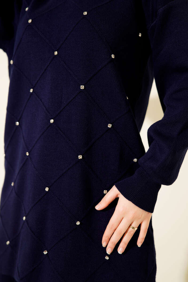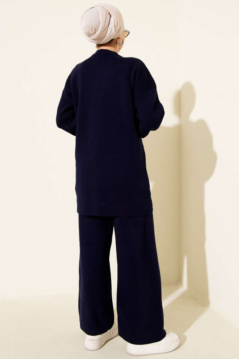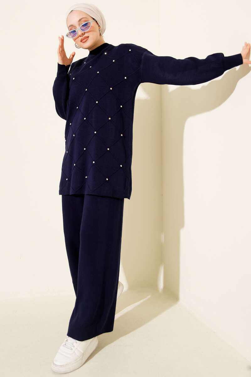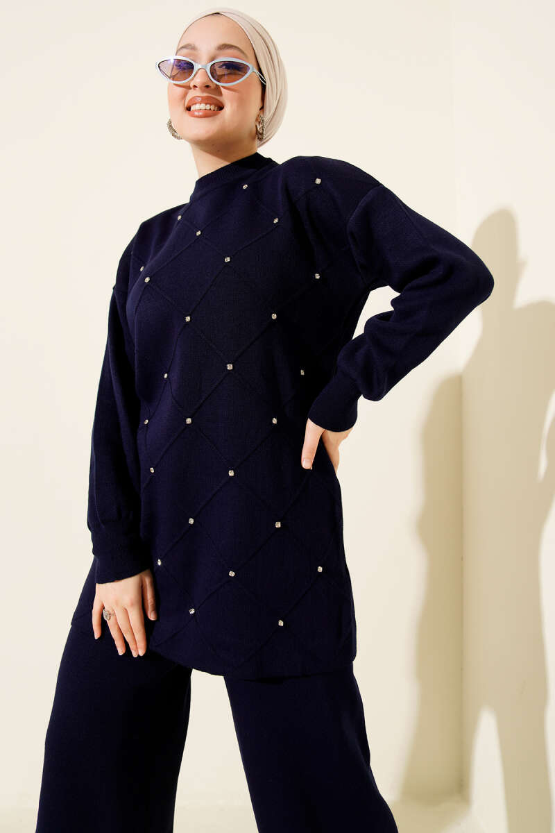 Kabartma Şeritli Taşlı Triko İkili Takım Lacivert