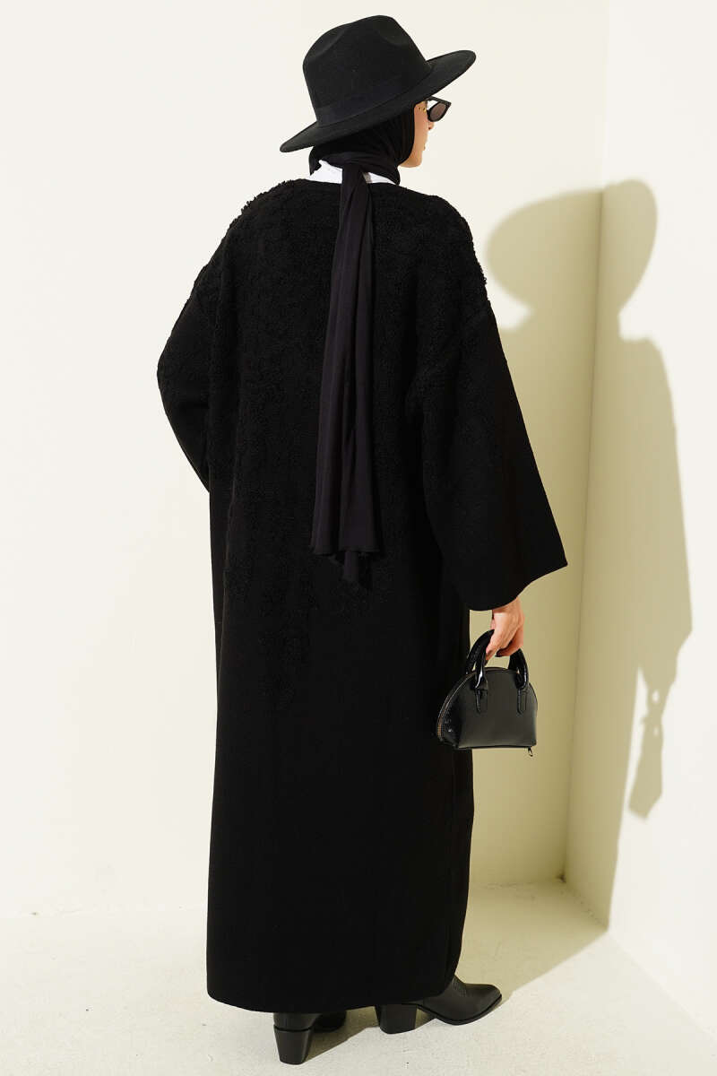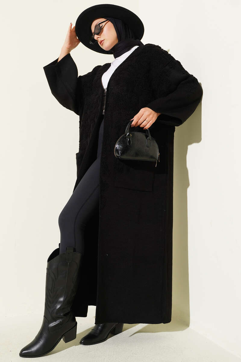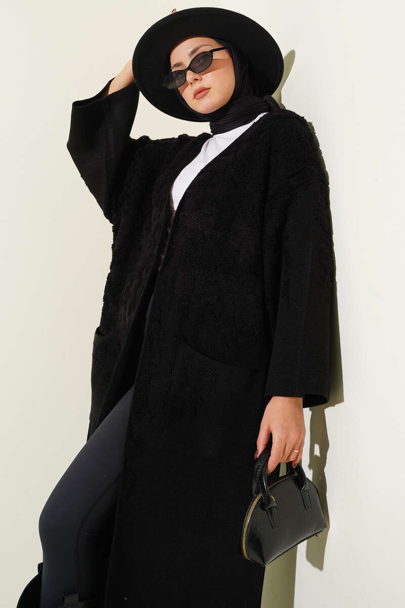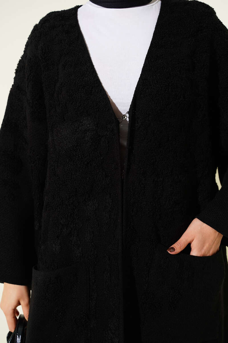 Zigzag Kabartmalı Triko Uzun Hırka Siyah