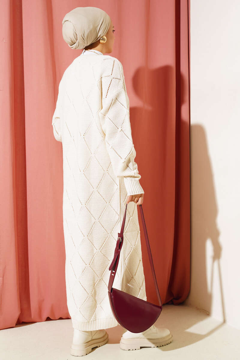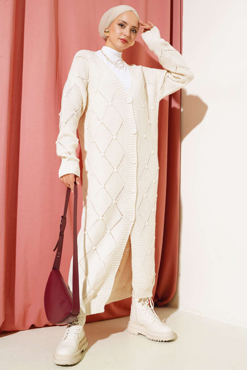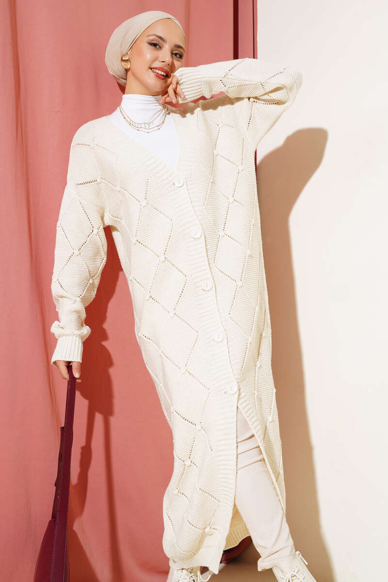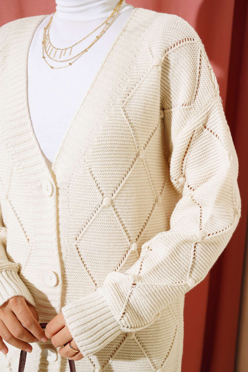 Saç Örgülü Düğmeli Triko Hırka Bej