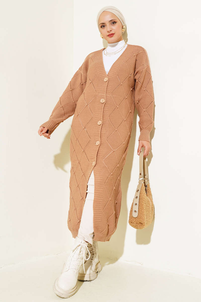 Saç Örgülü Düğmeli Triko Hırka Bej