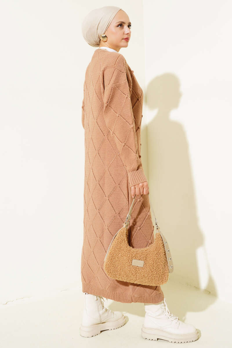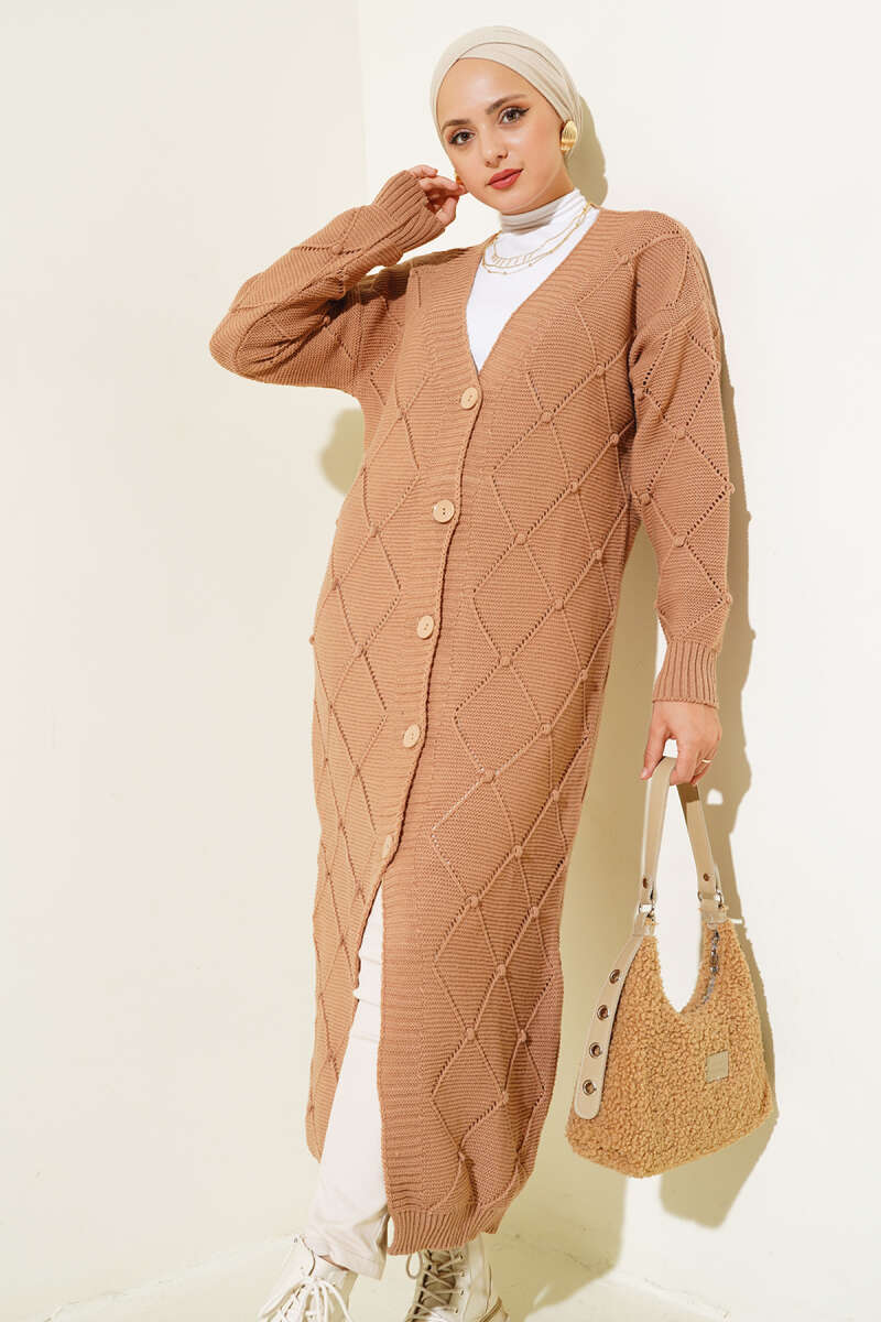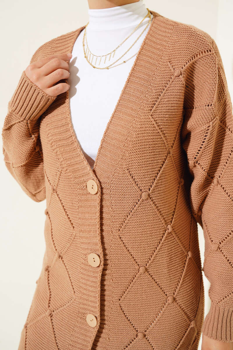 Saç Örgülü Düğmeli Triko Hırka Kahve