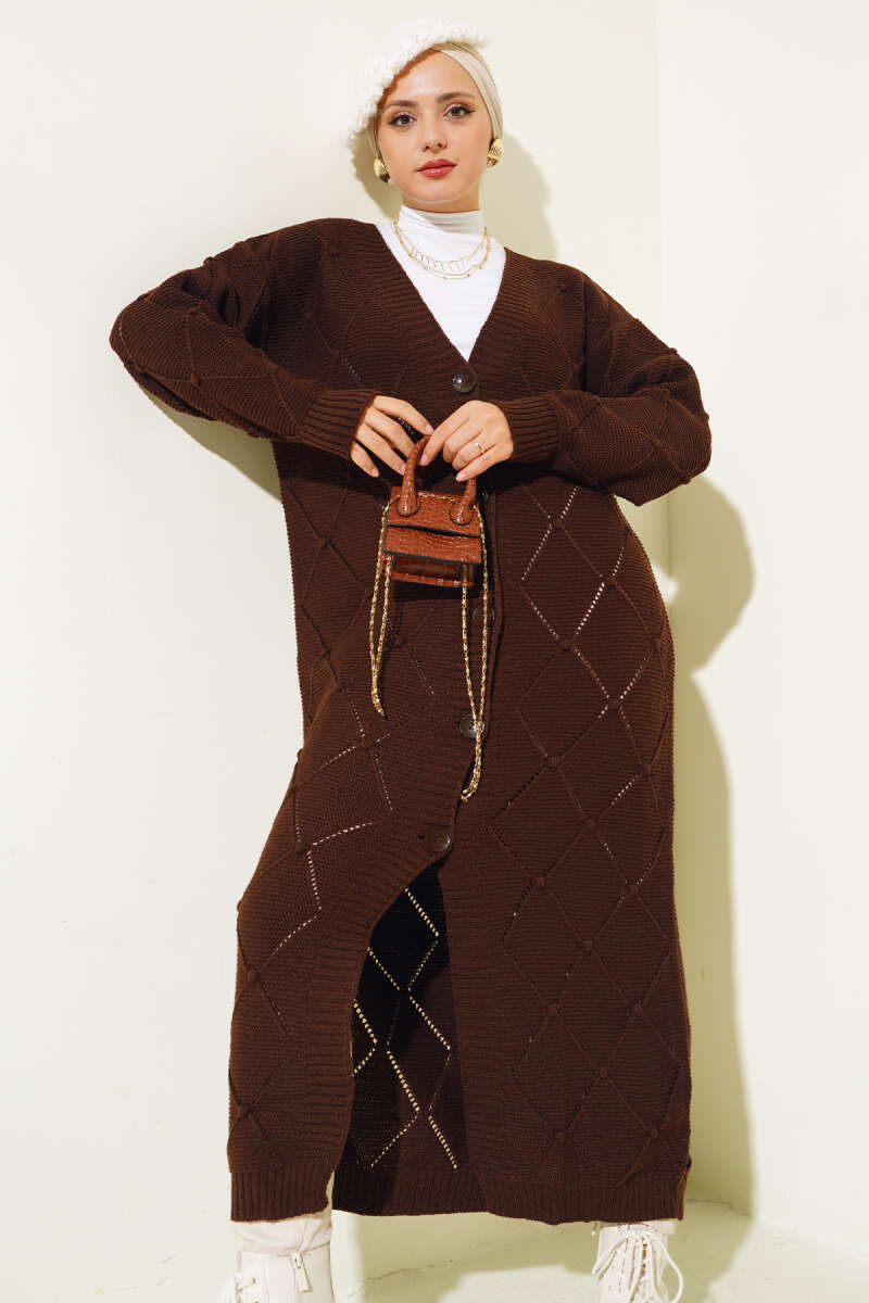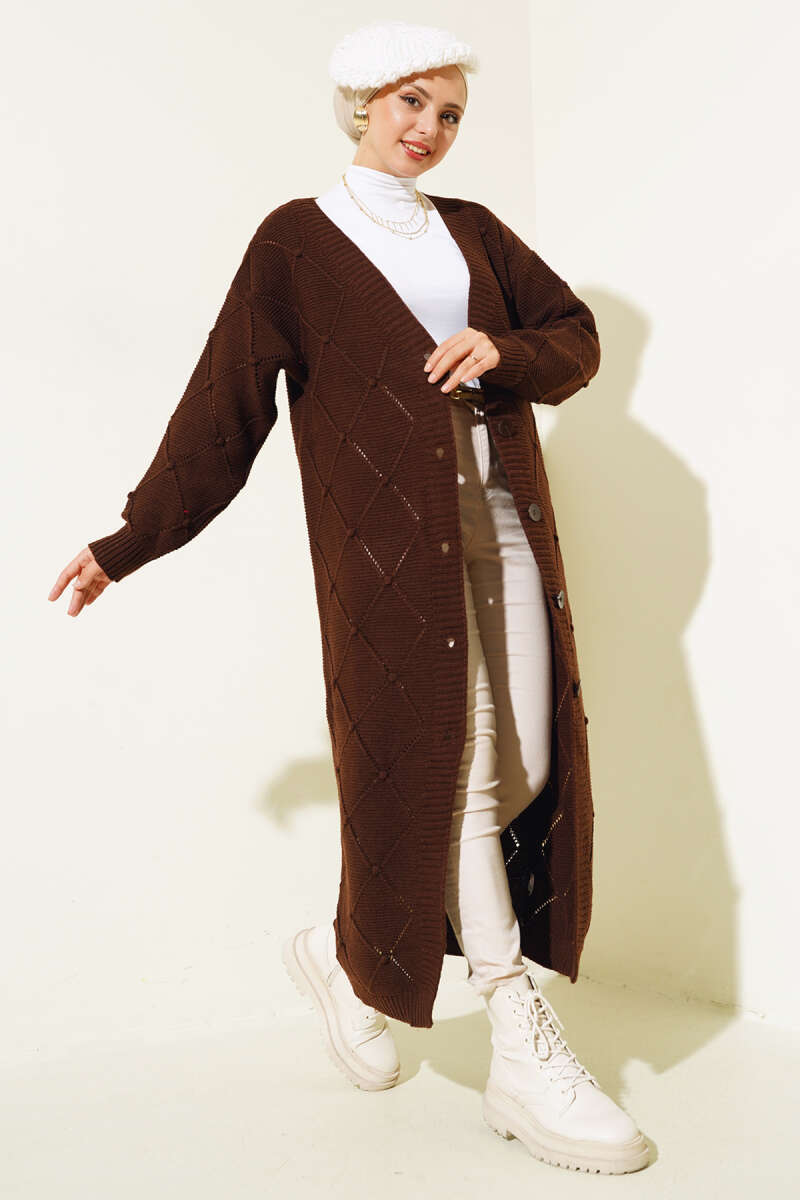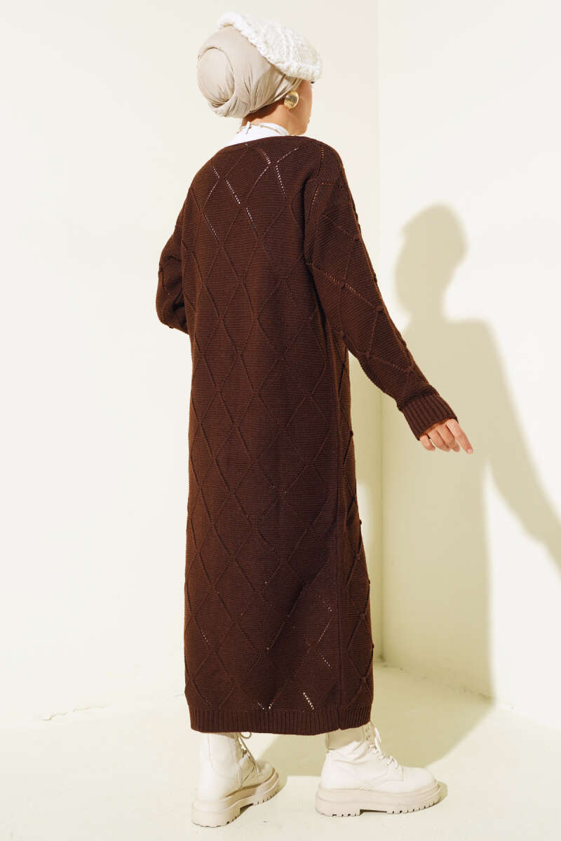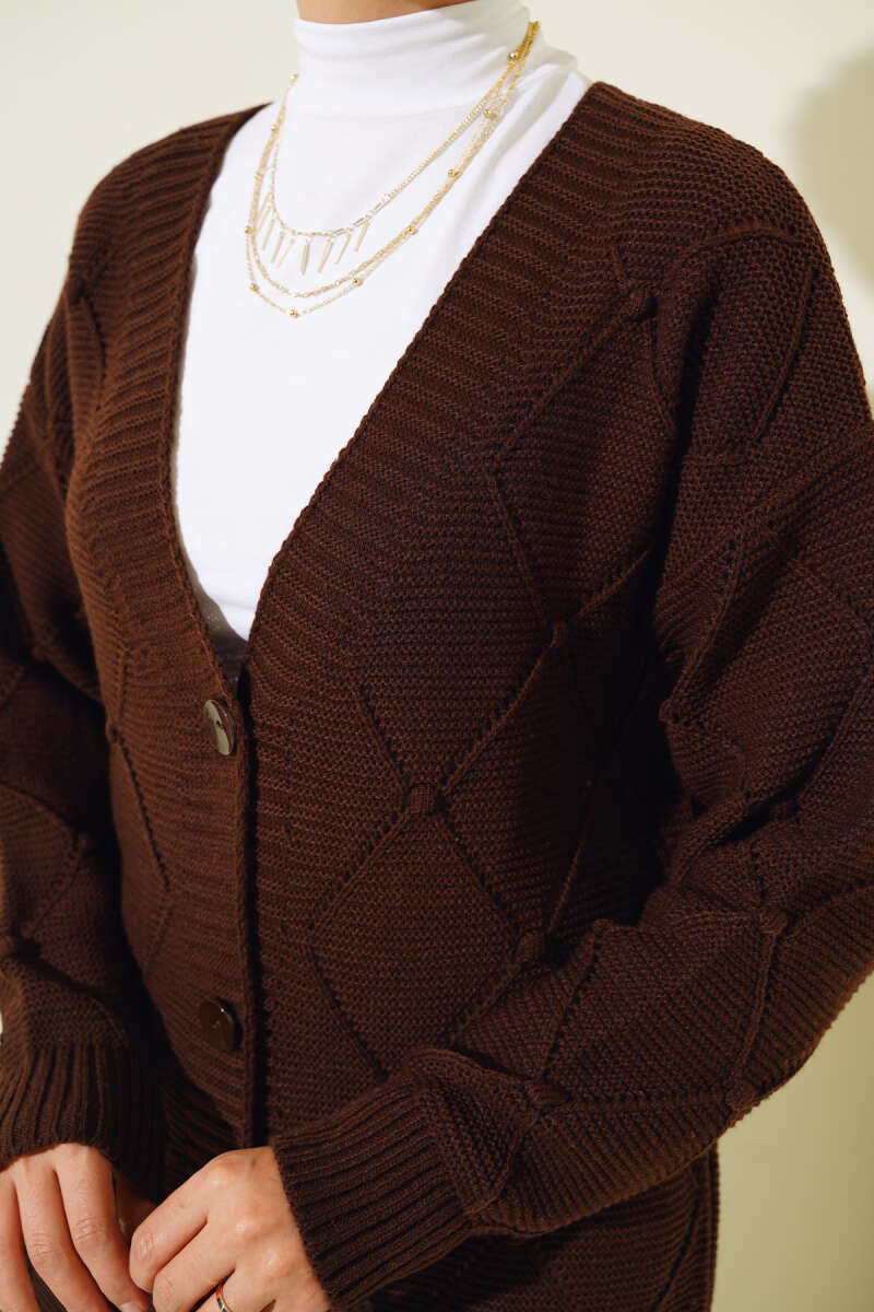 Saç Örgülü Düğmeli Triko Hırka Kahve